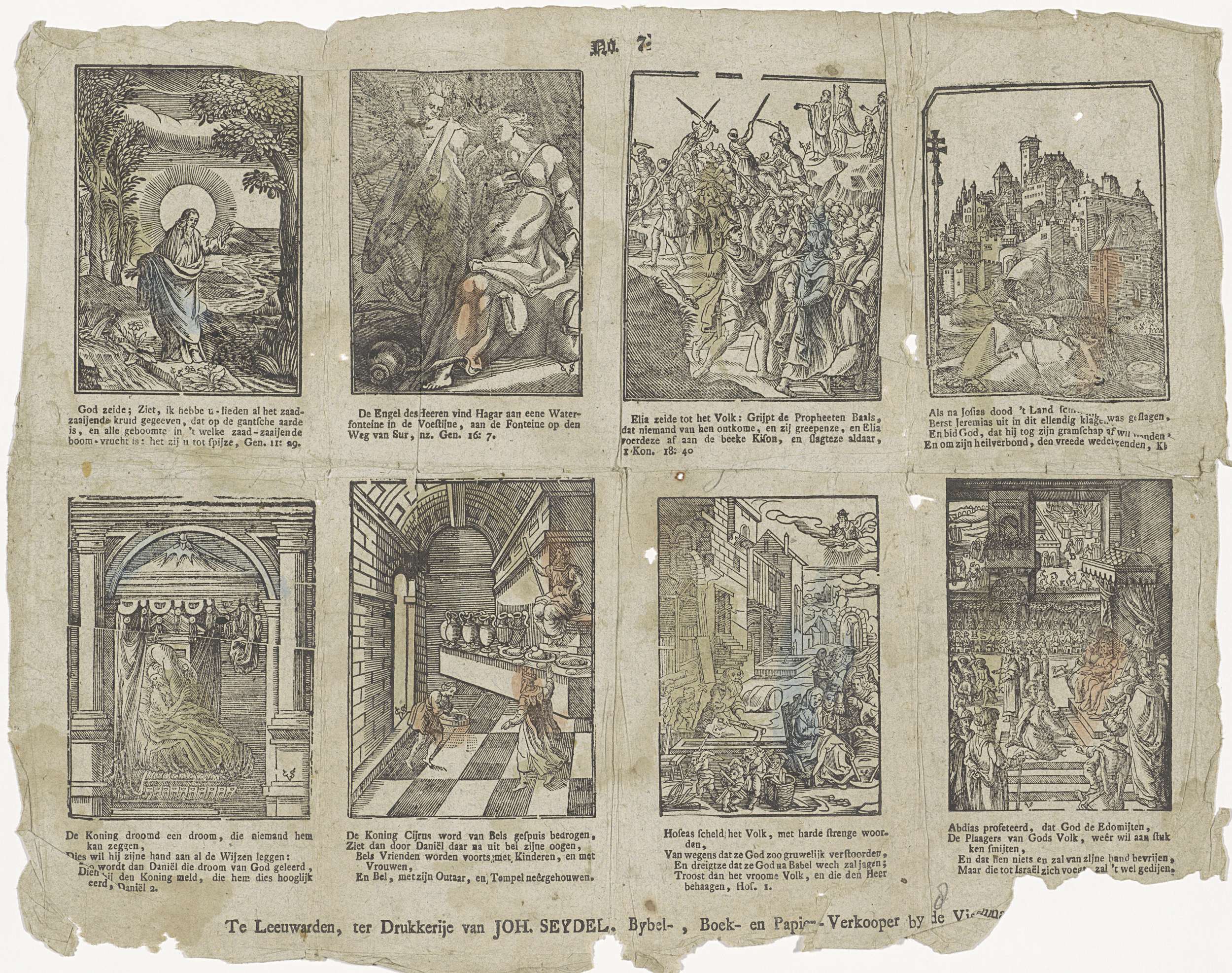 Blad met 8 voorstellingen van verhalen uit het Oude Testament. Onder elke afbeelding een onderschrift. Genummerd midden boven: No. 7.