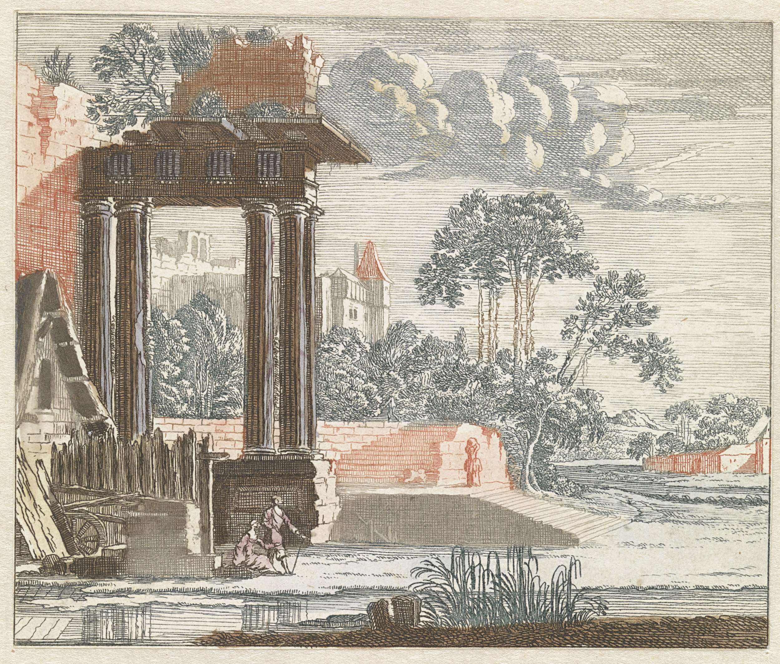 Landschap met een ruïne van een Romeinse tempel links en water op de voorgrond.