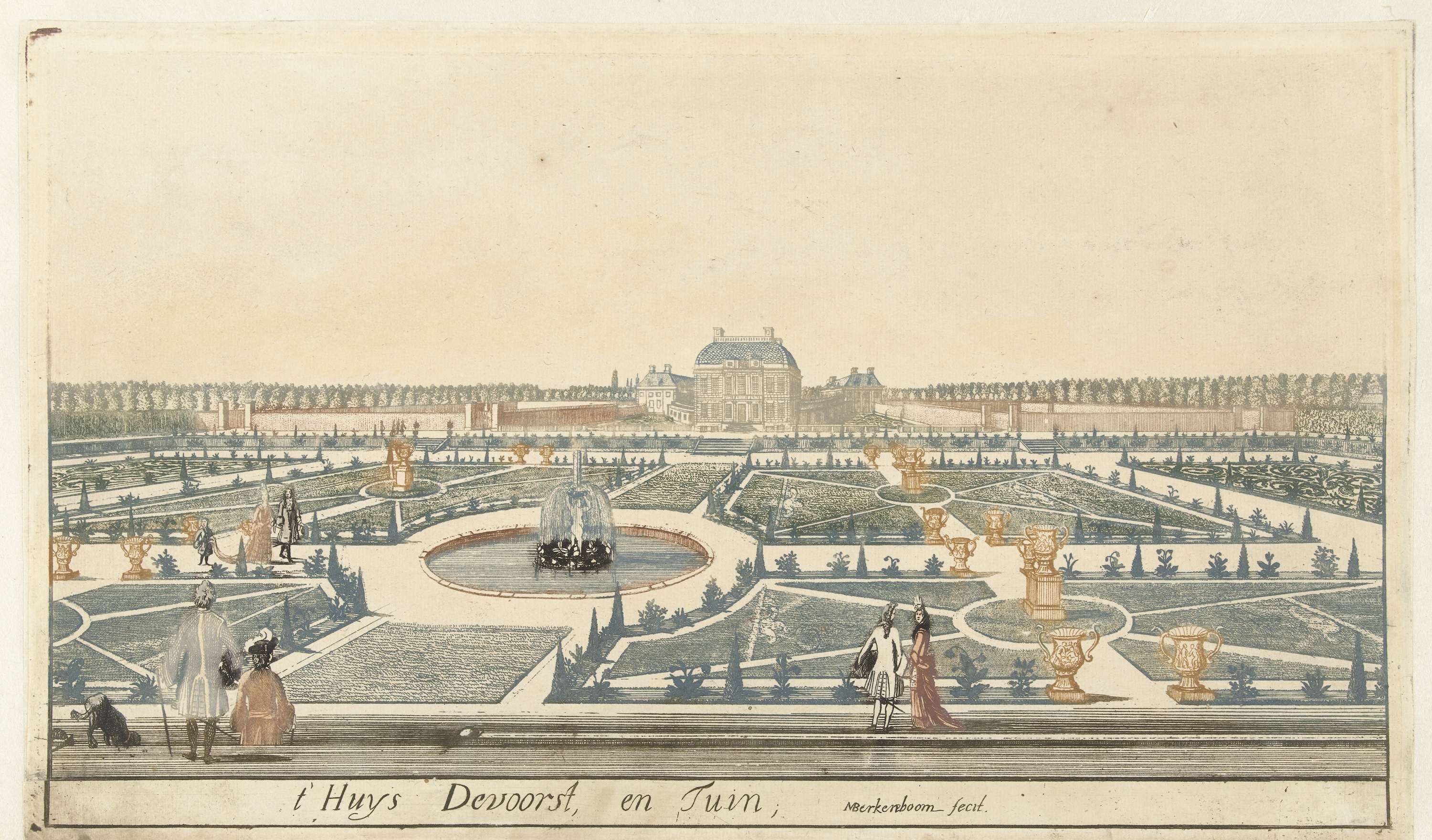 Gezicht op Huis De Voorst en de door wandelaars bevolkte tuin.