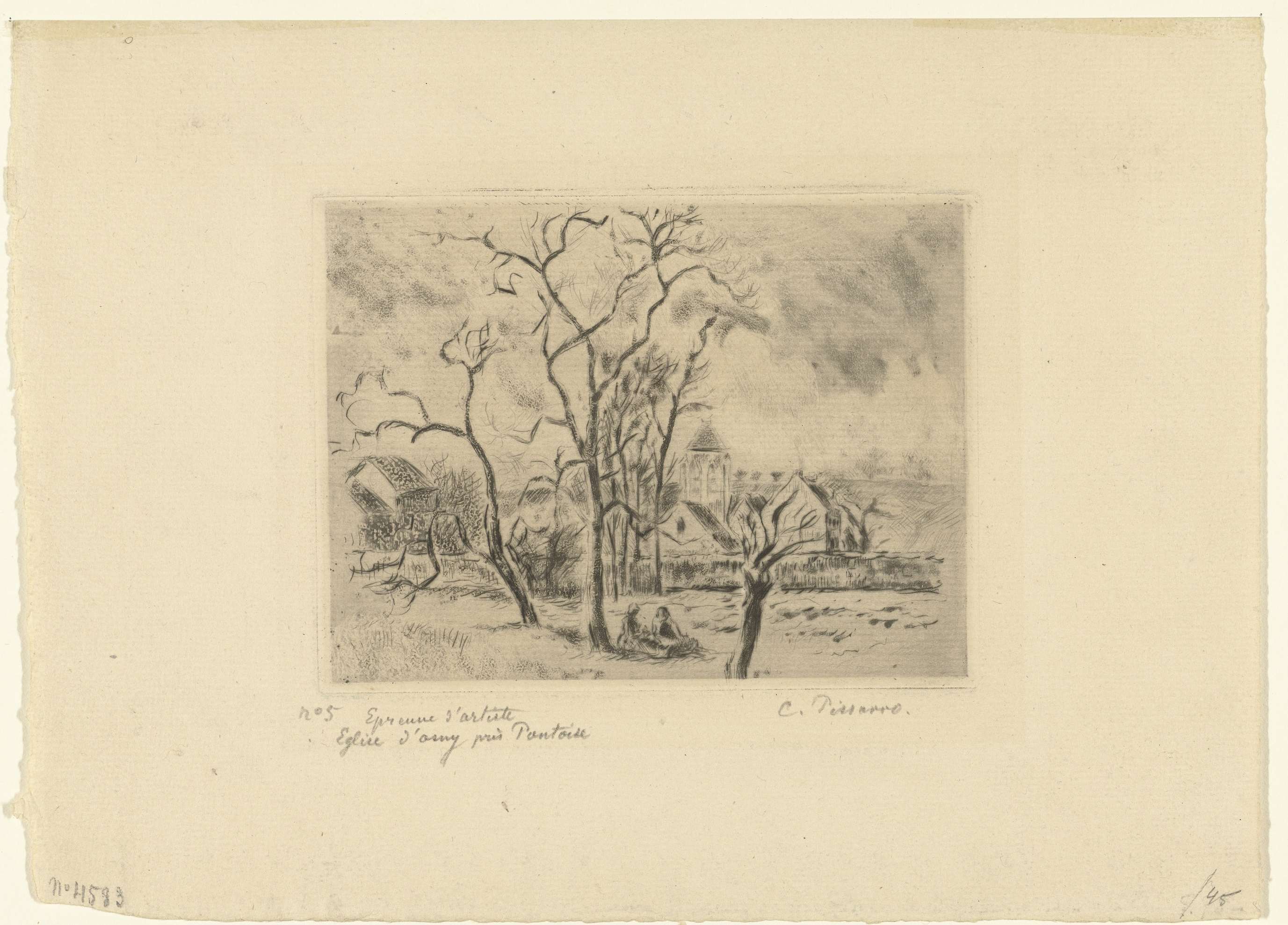 Een weide met twee vrouwen zittend onder een boom. Achter een muurtje het dorpje Osny, met een aantal huizen en een kerk.
