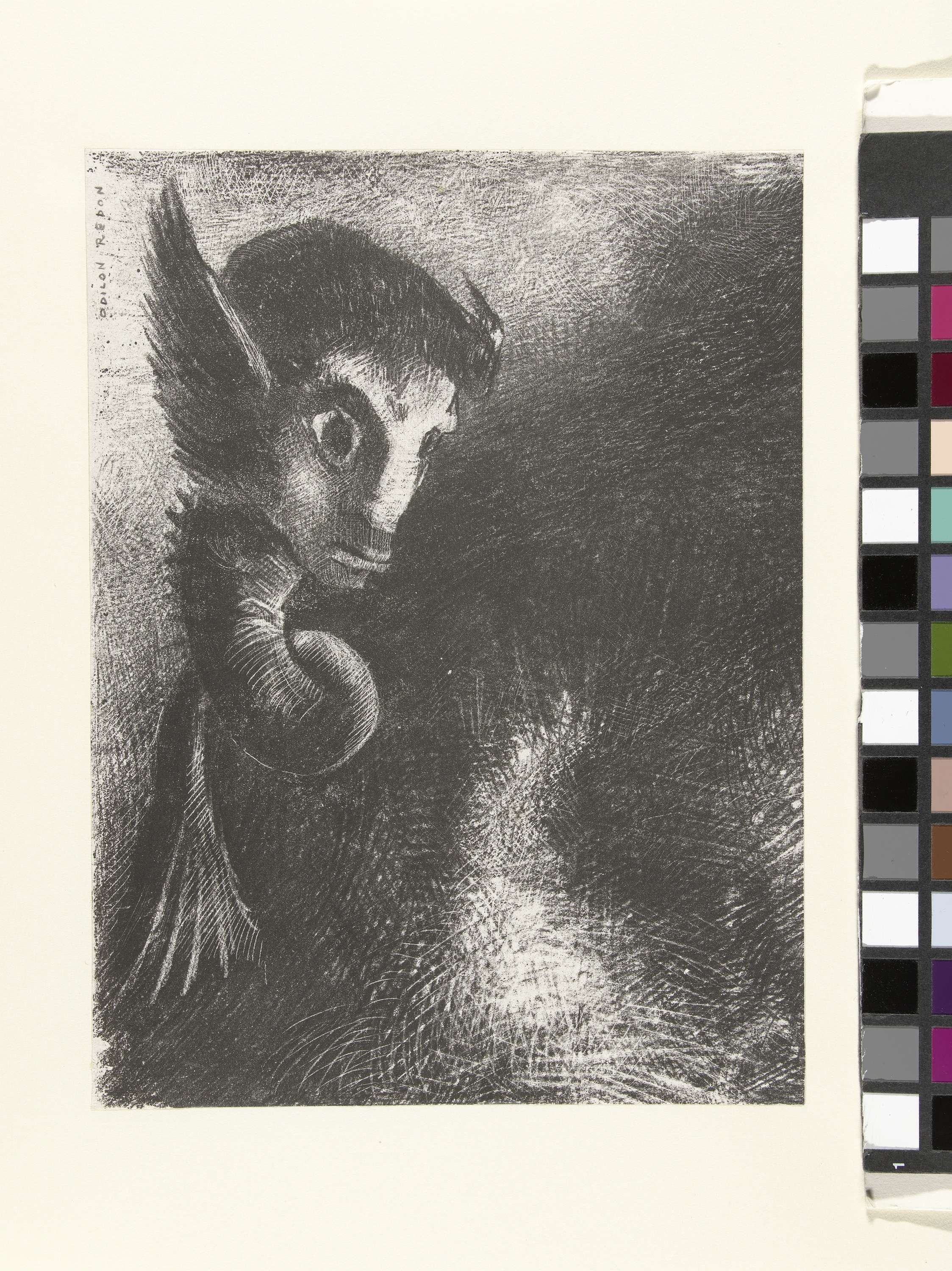 Een chimaera, een duivelachtig figuur met gevleugelde oren en een vissenstaart. Prent uit een serie van zes, gemaakt voor een album.