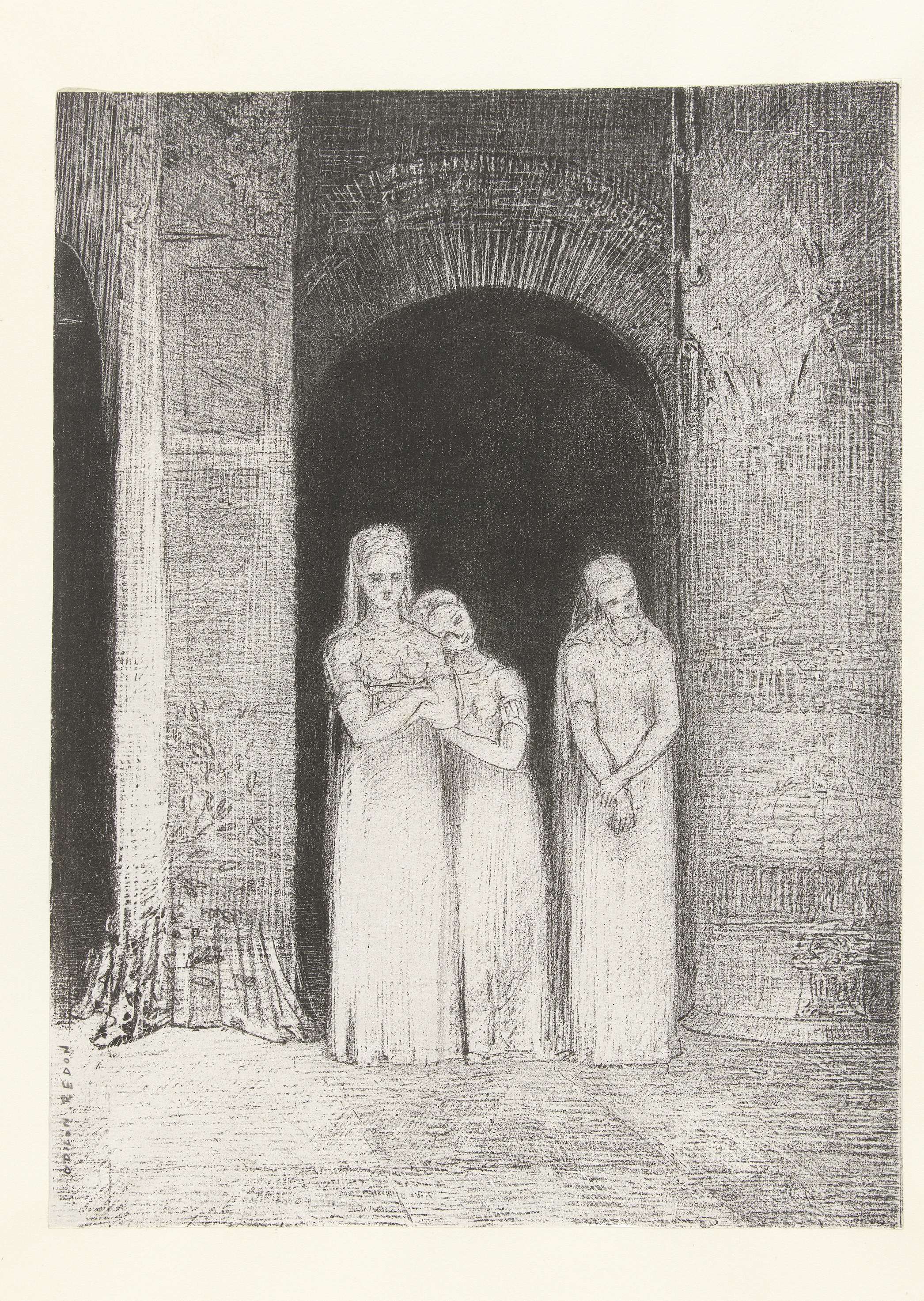 Drie priesteressen bij de ingang van een tempel. Prent uit een serie van zes, gemaakt voor een album.