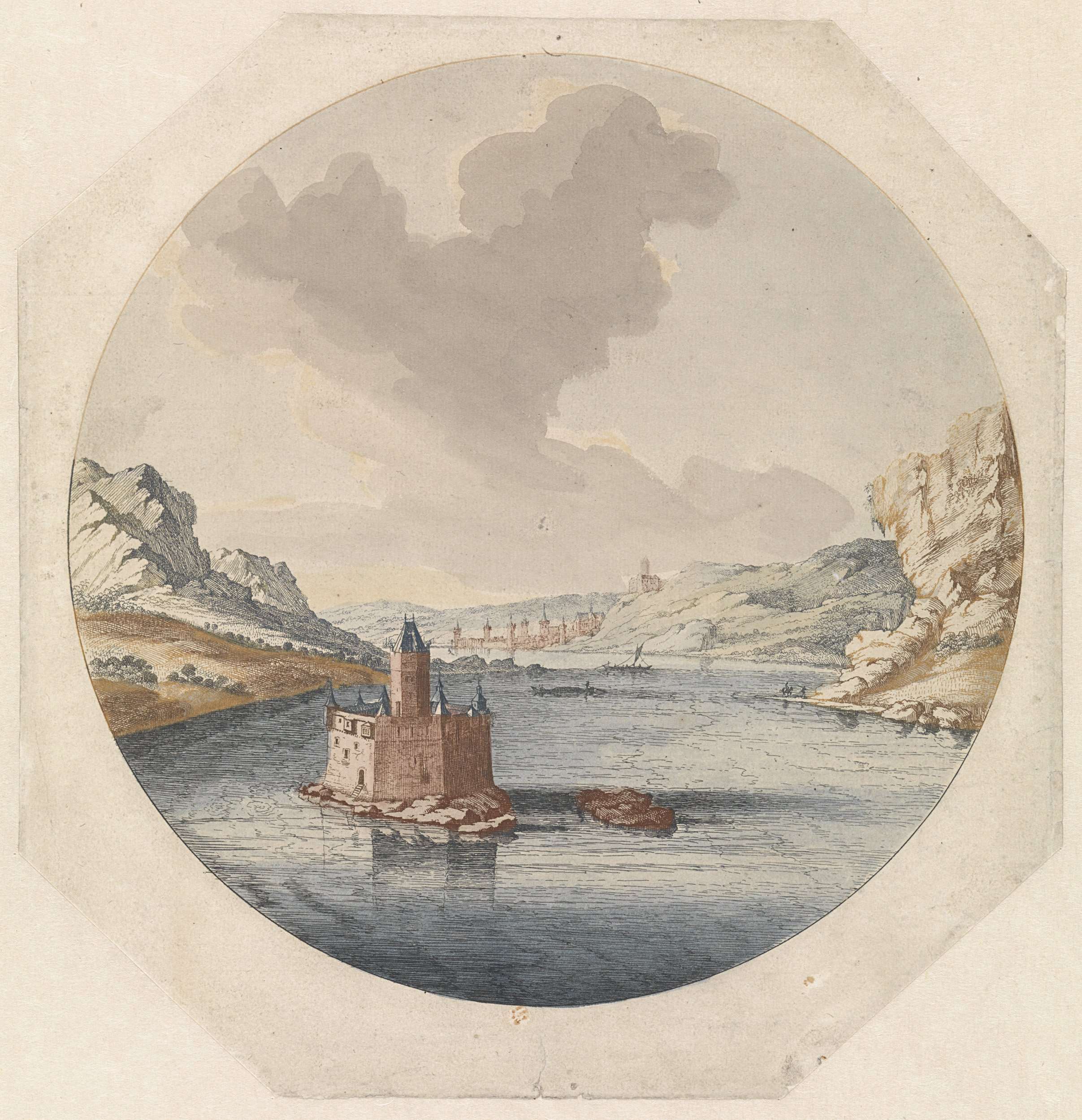 Gezicht op de tolburcht Pfalzgrafenstein in de Rijn. Op de achtergrond de stad Kaub met daarboven op de heuvel burcht Gutenfels.