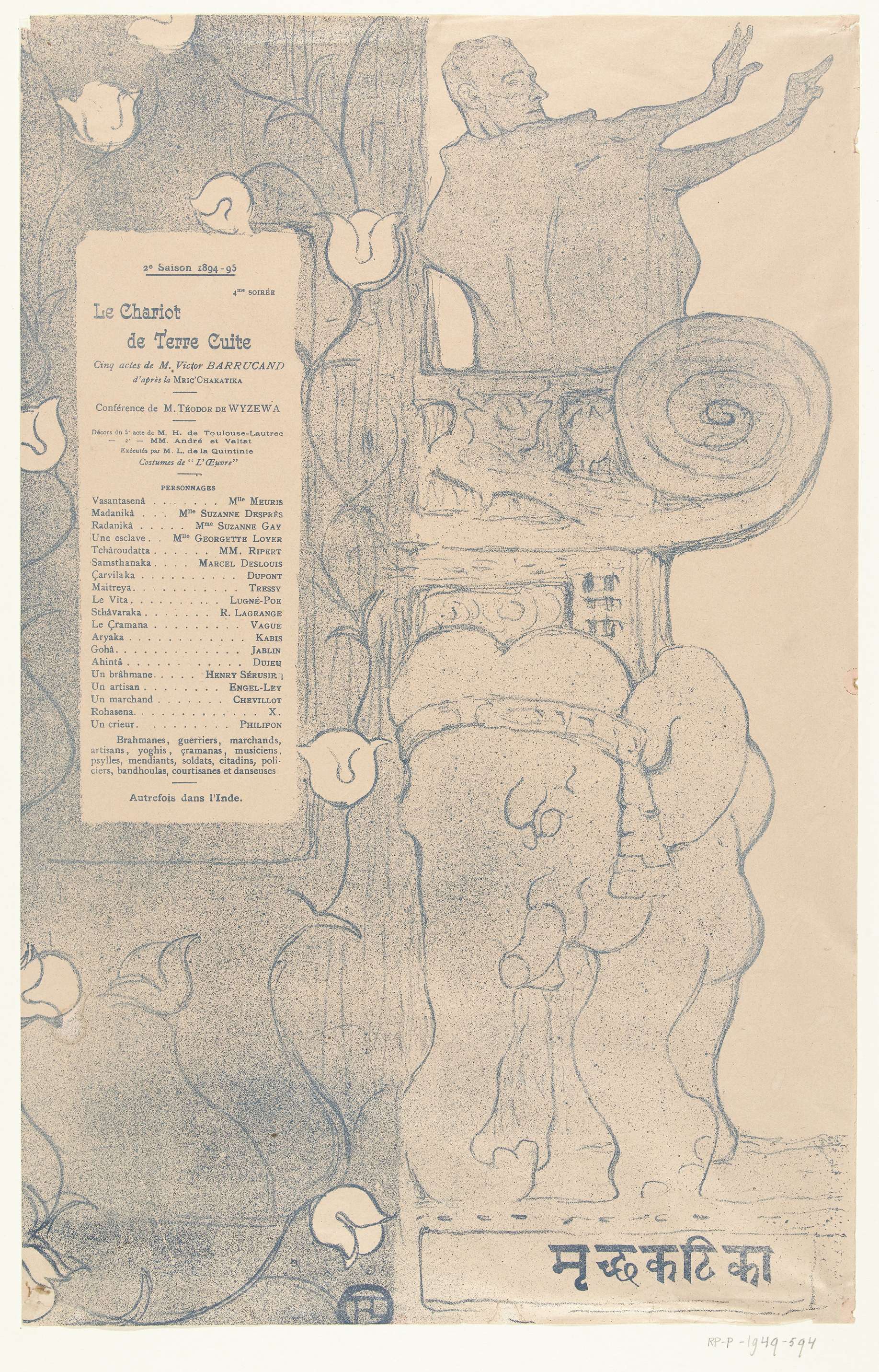 Programma voor het toneelstuk Le chariot de terre cuite met acteur Felix Fénéon als Hindoestaanse priester staand op balkon boven beeld van Indische olifant. In een rechthoekig kader staan de titel en rolverdeling vermeld.