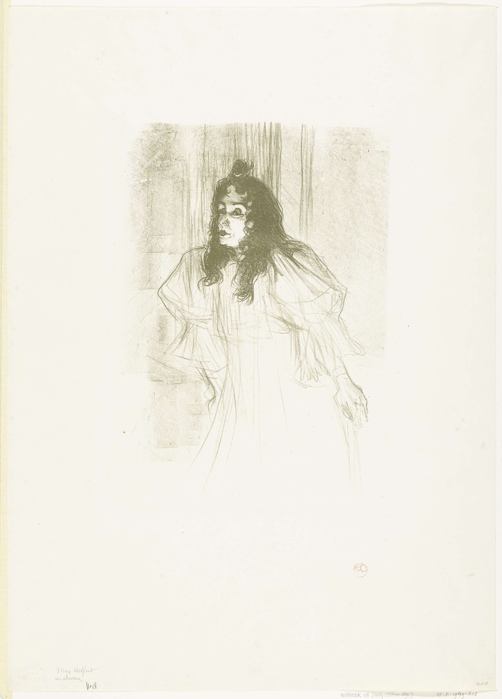 De Ierse zangeres May Belfort met haar betoverende Engelse accent werd een rage in Parijs. Lautrec heeft haar meermalen geportretteerd. In dit geval heeft hij het effect van het voetlicht (lampen beneden op het podium) ten volle gebruikt. De act van Belfort bestond uit het met lispelende stem en treurig gezicht zingen van dubbelzinnige kinderliedjes, ...