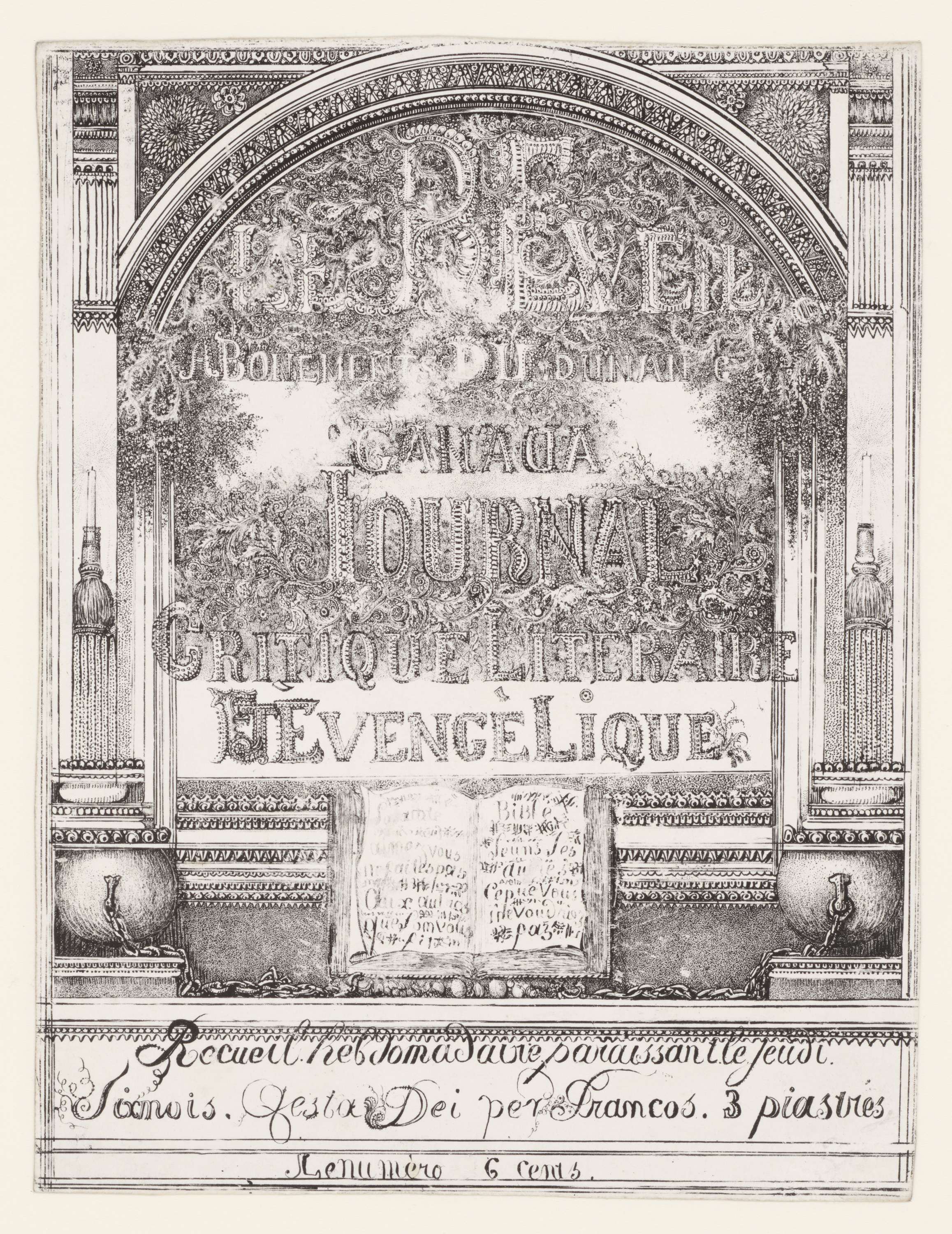 Titelprent met titel Le Réveil du Canada en ondertitel Journal Critique Literaire et Evengèlique in omlijsting met architectuur ornamenten. De letters van de titel zijn geplaatst tussen fijn gedetailleerd krullend bladwerk. In de tekst staan verschillende spelfouten. Onder de titel is een opengeslagen bijbel weergegeven met een rebus-achtige tekst. In de ondermarge van de omlijsting ...