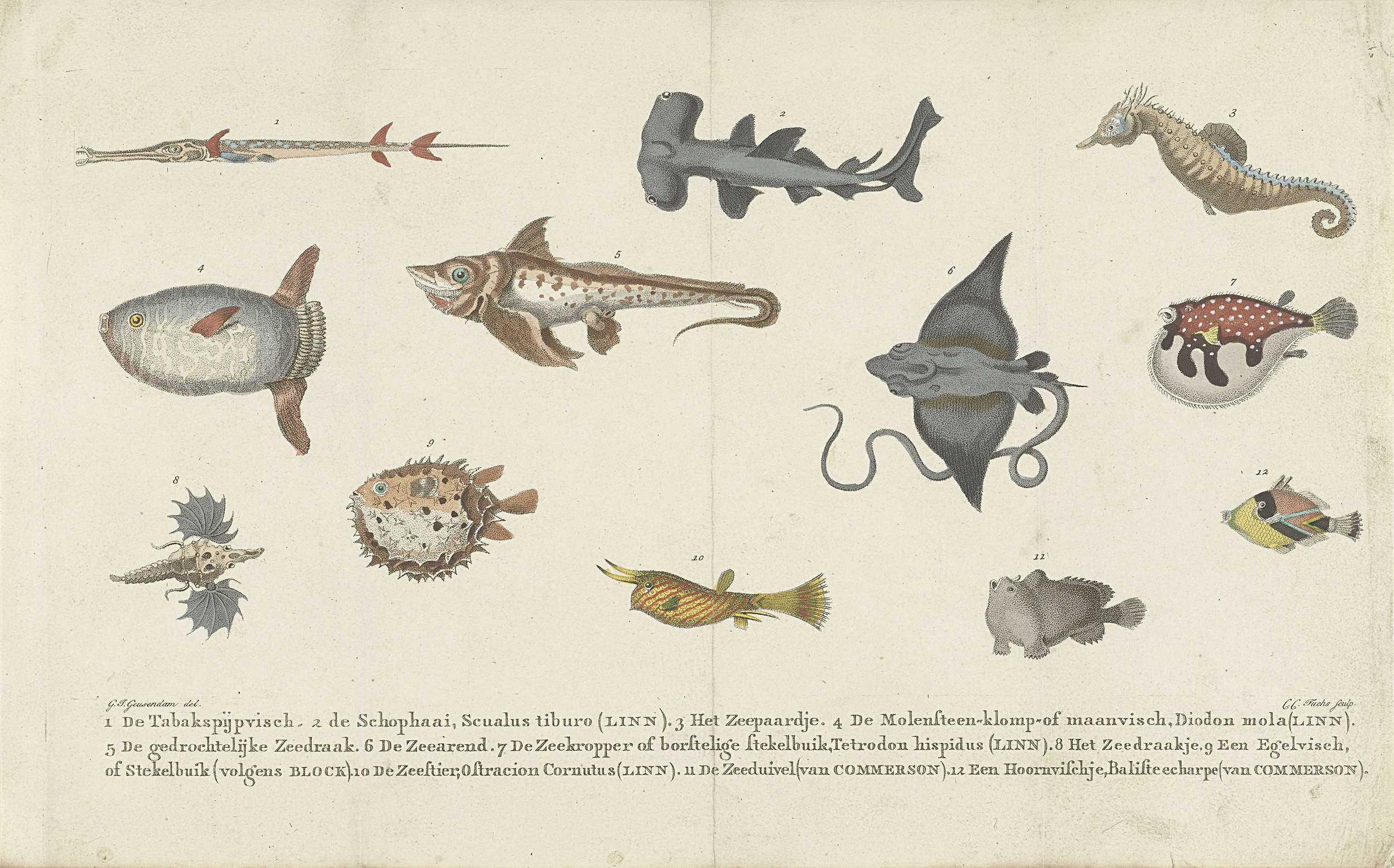 Wetenschappelijke weergave van twaalf vissen met een legenda van 1 tot en met 12.
