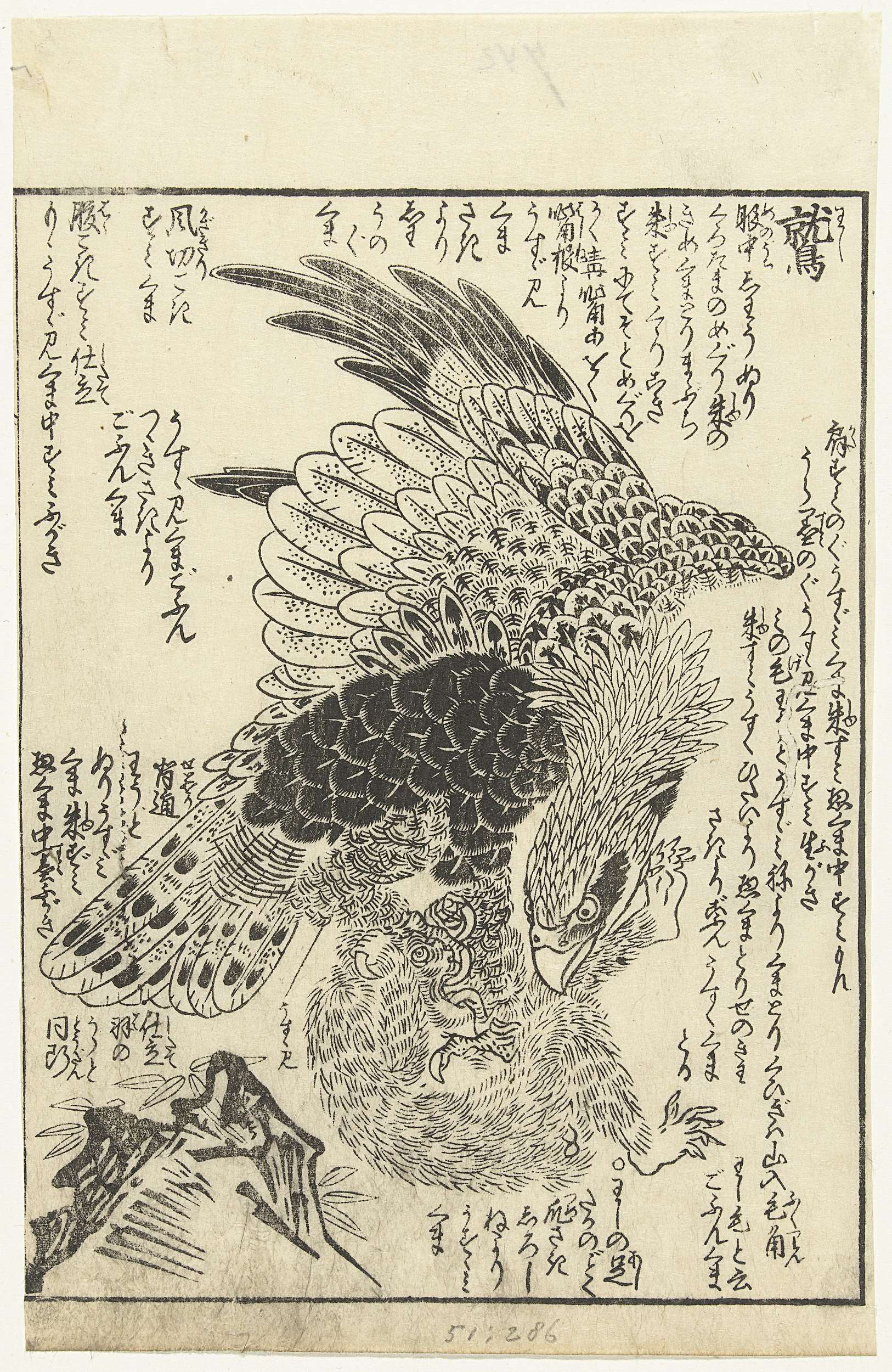 Roofvogel vechtend met aap; tekst rondom de voorstelling.