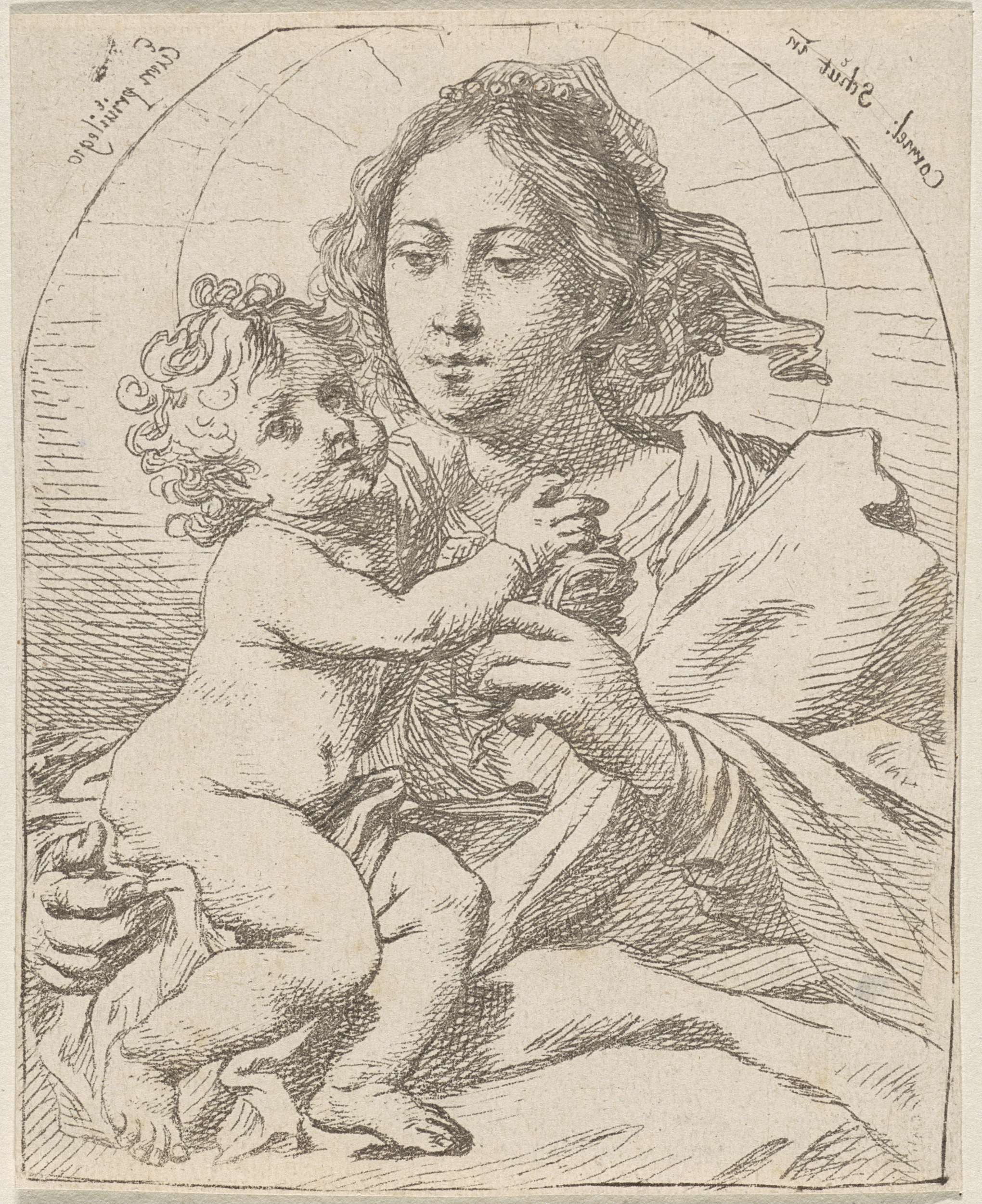 Het Christuskind zit op de arm van Maria, die in haar hand een roos vasthoudt.