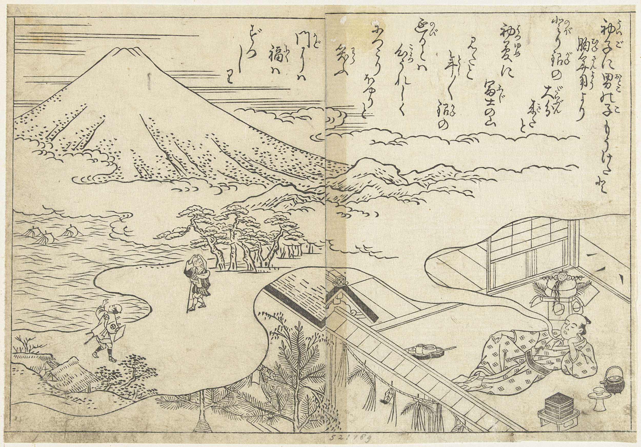 Man, liggend in kamer, dromend over zijn reis naar de berg Fuji. Twee pagina`s, aan elkaar geplakt, uit een Japans boek.