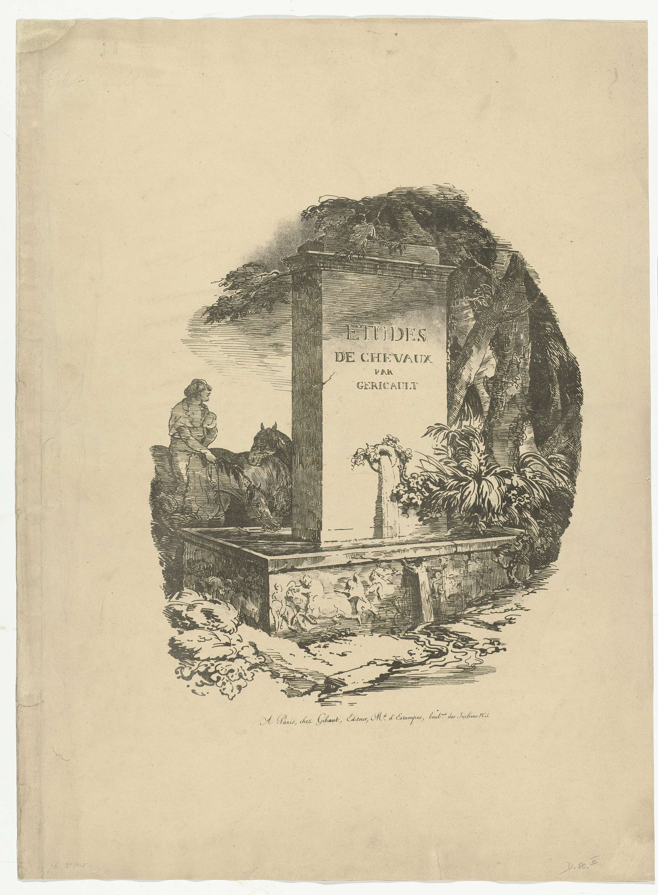 Omslag voor de serie Etudes de chevaux, deels kopiëen naar de eerdere Engelse reeks. Een vrouw met drie paarden bij een drinkplaats.