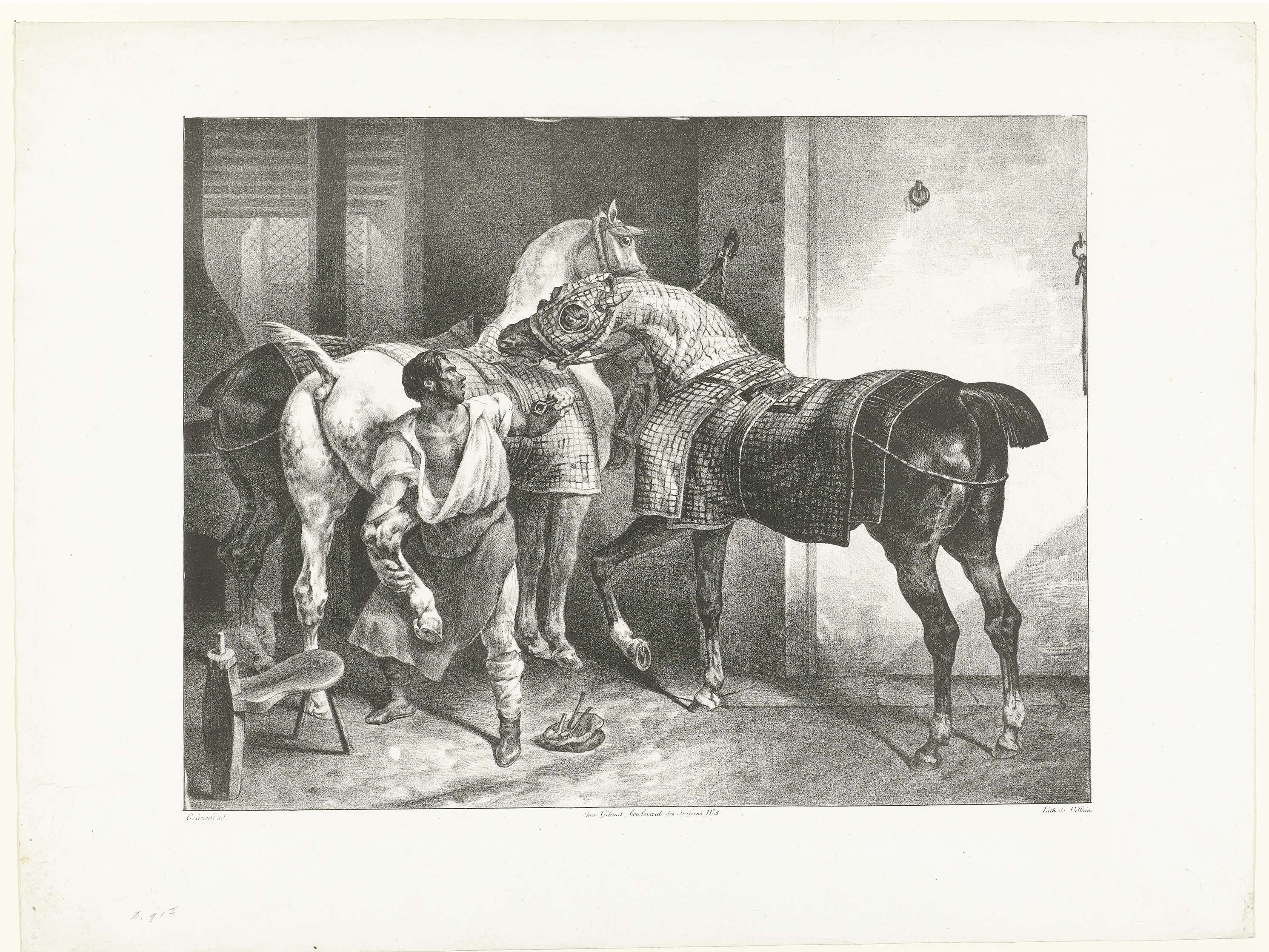 Drie paarden bij de Engelse hoefsmid. Het paard rechts bijt het middelste dier.