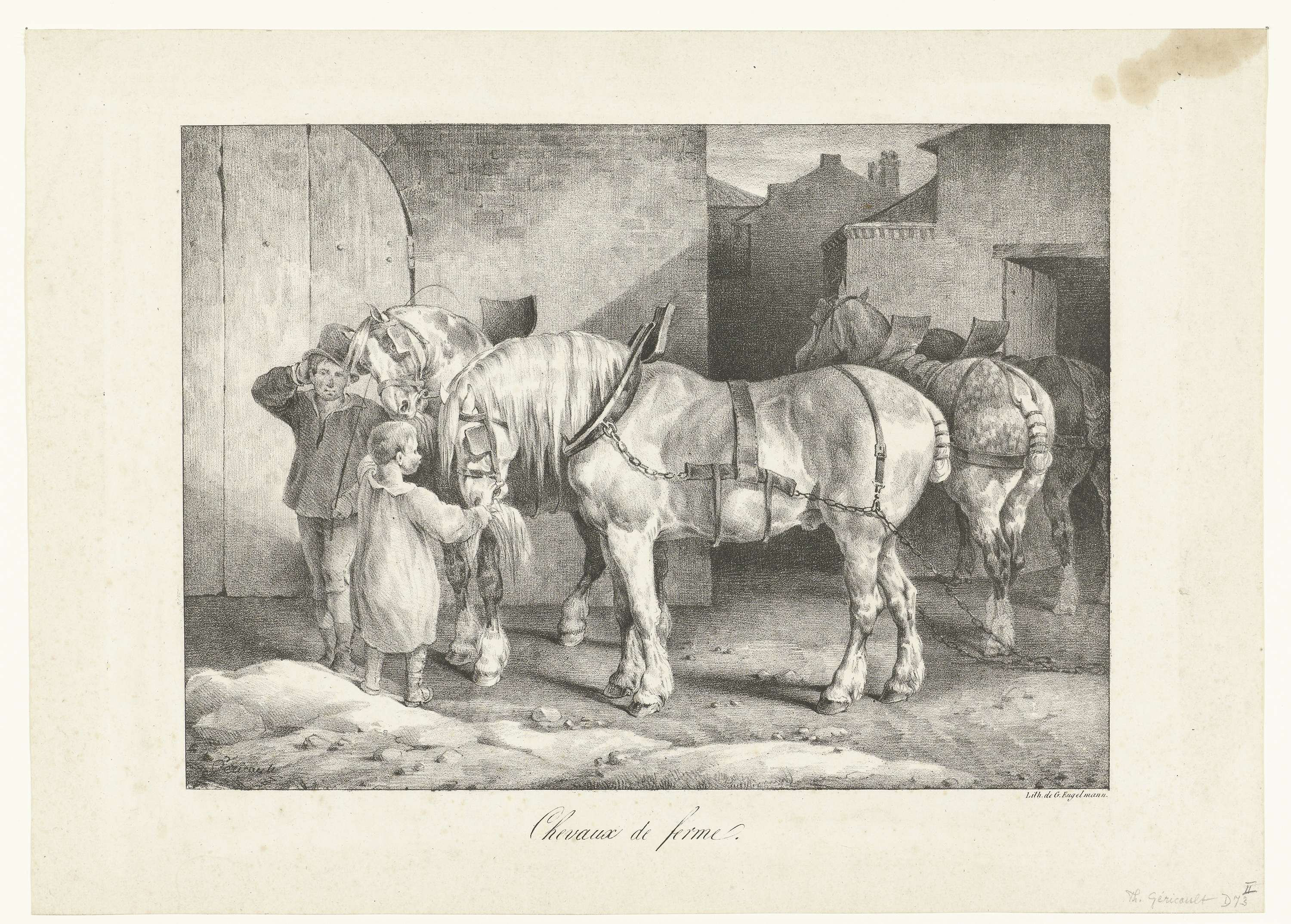 Een jongetje geeft twee werkpaarden hooi, de stalknecht staat ernaast.