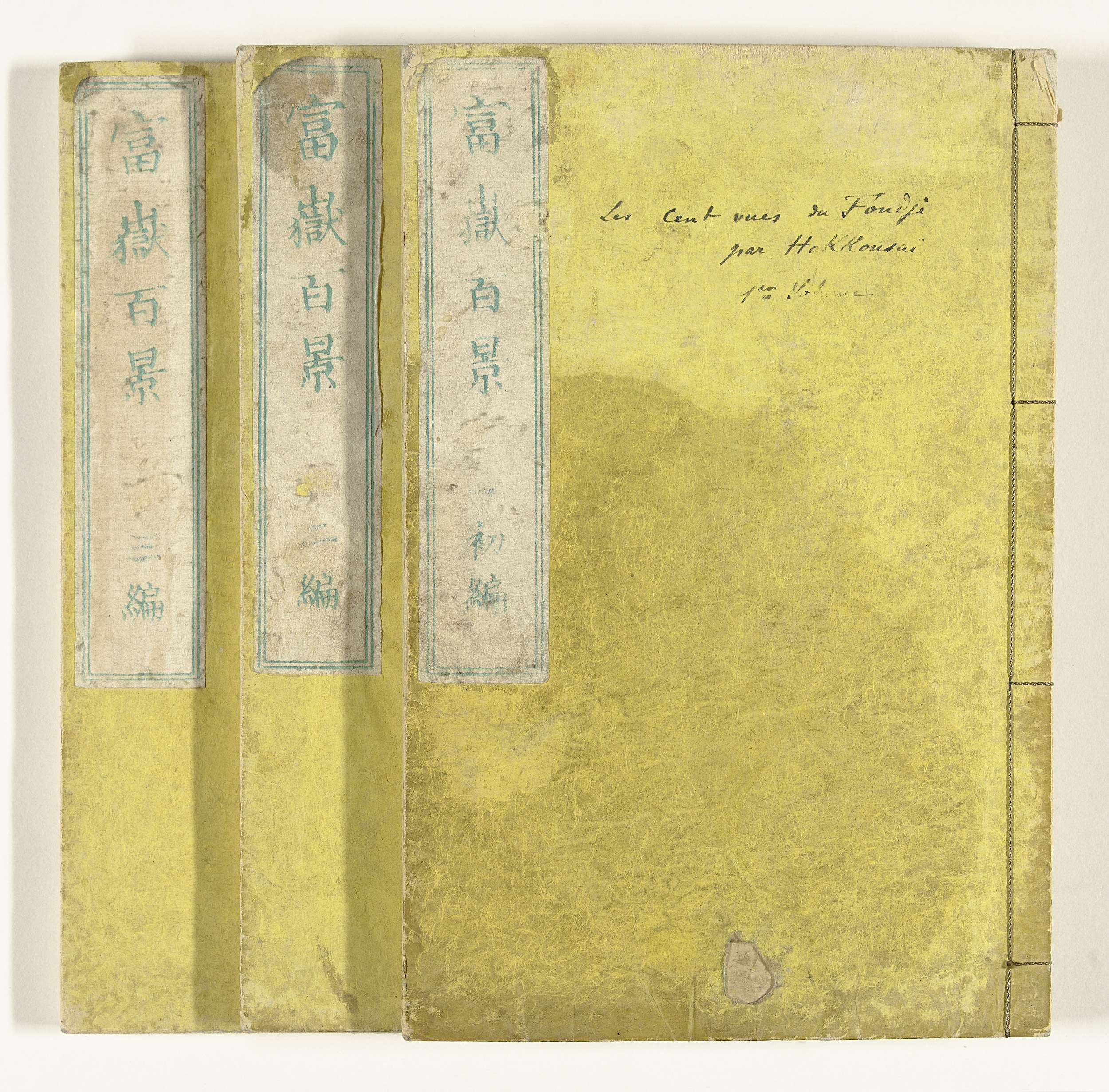 Drie delen (compleet) met zwart-wit afbeeldingen van de berg Fuji en omgeving; bewaard in rode chitsu (uitklapbaar doosje). Meiji herdruk.