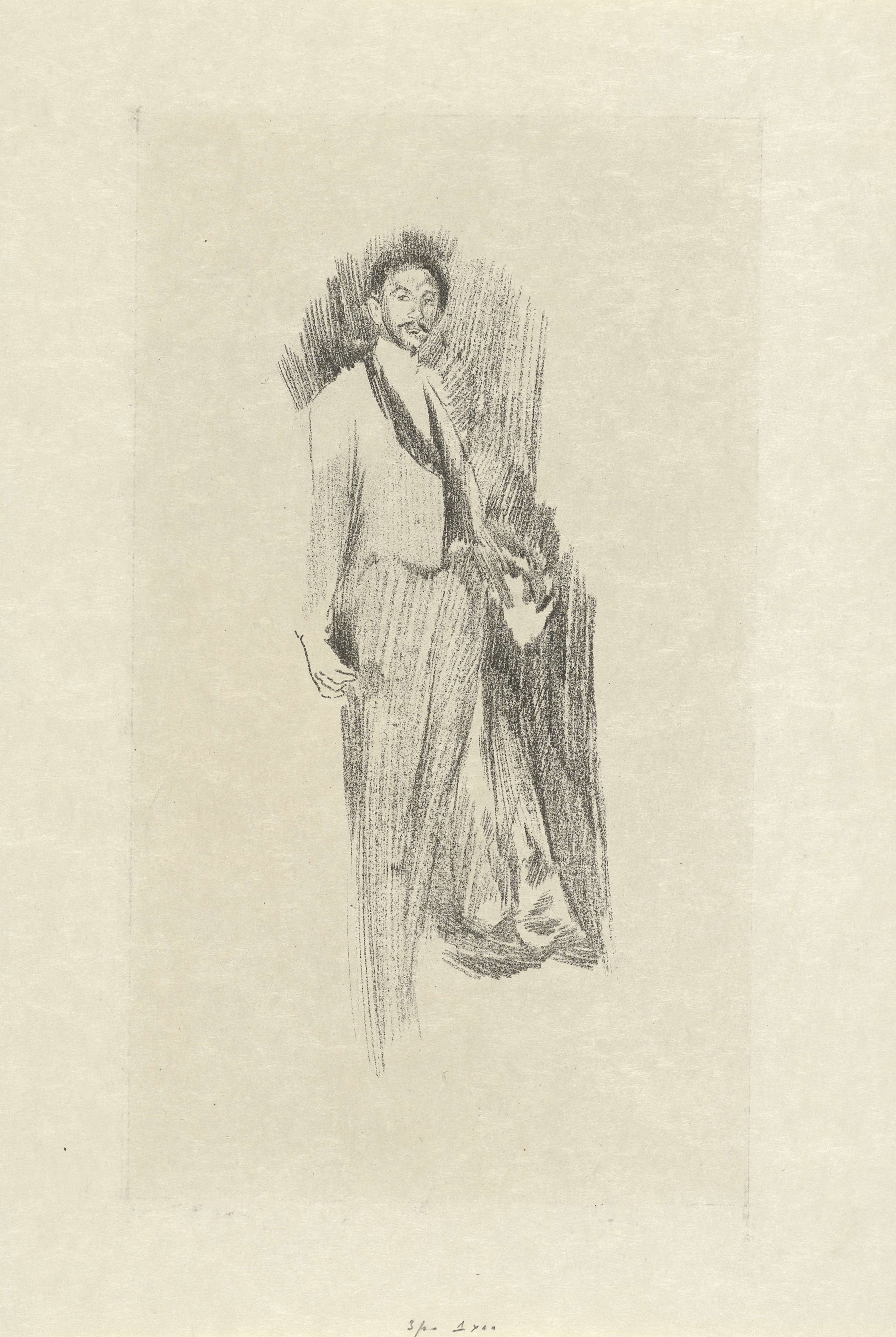 Portret van graaf Robert de Montesquion, staand, met een bontmantel over zijn linker arm.