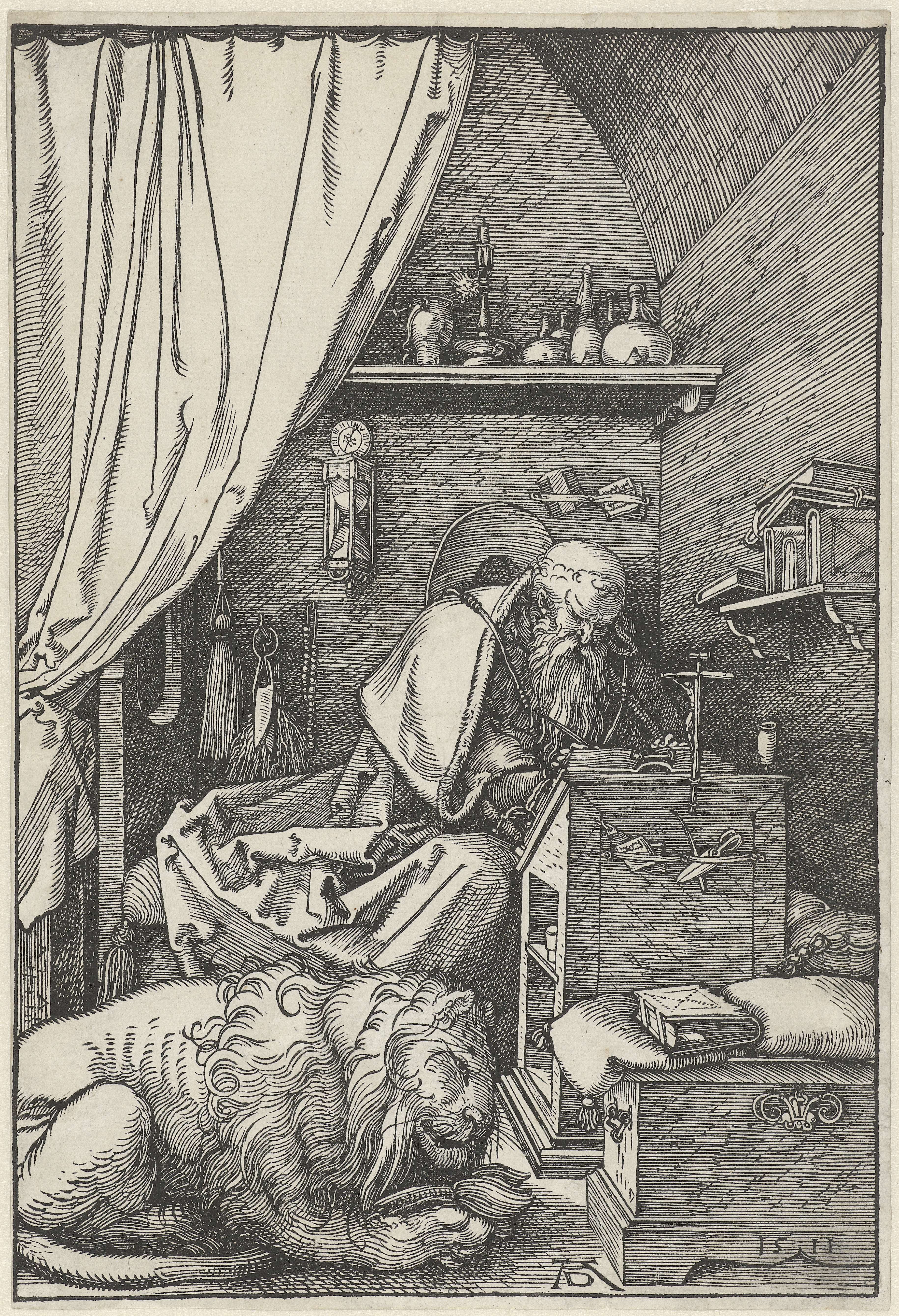 De Heilige Hiëronymus zit in een studeervertrek te schrijven aan een lezenaar bij een gordijn. Op de voorgrond ligt een leeuw.