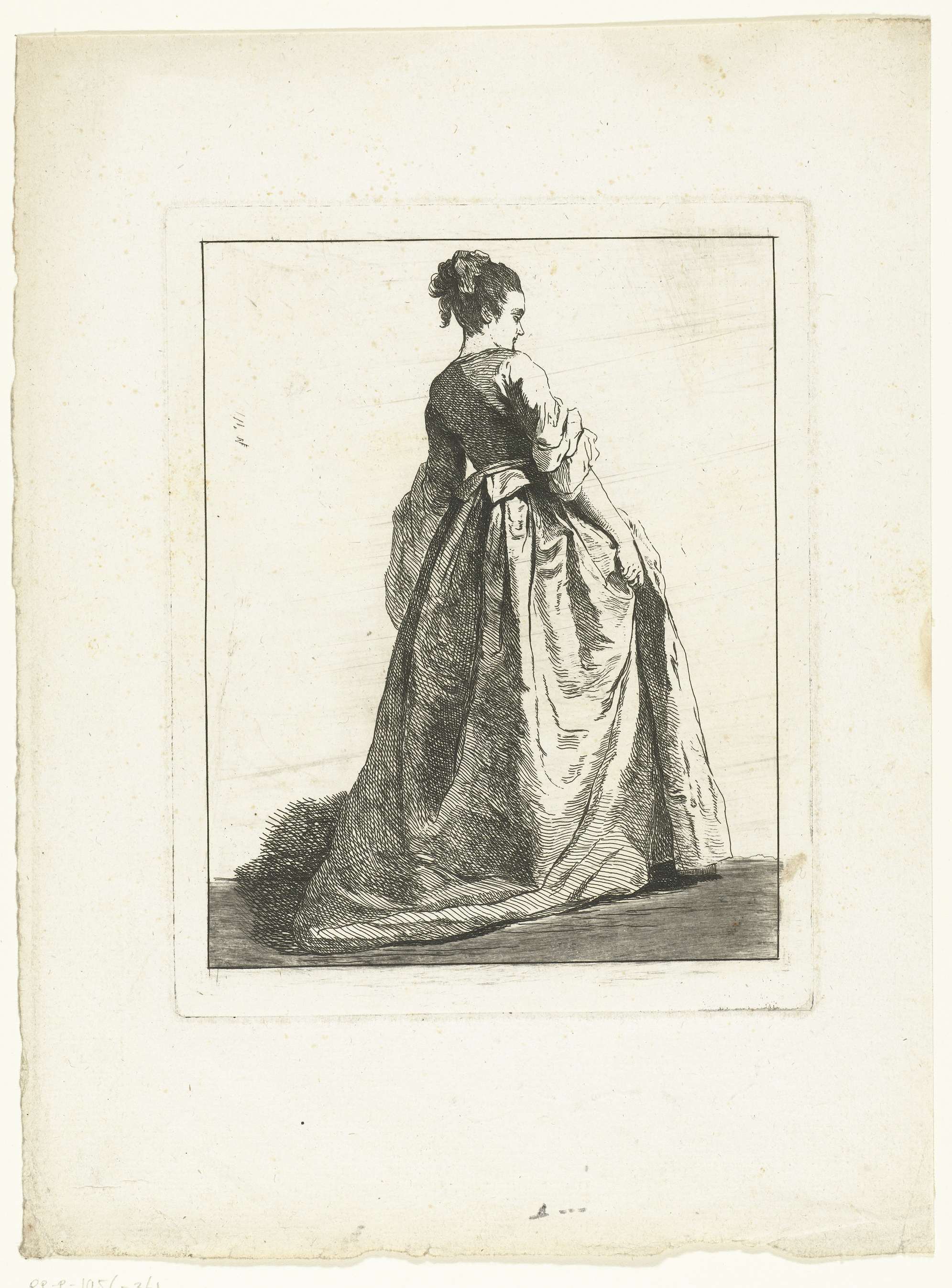 Staande jonge vrouw, in een lange jurk, op de rug gezien.