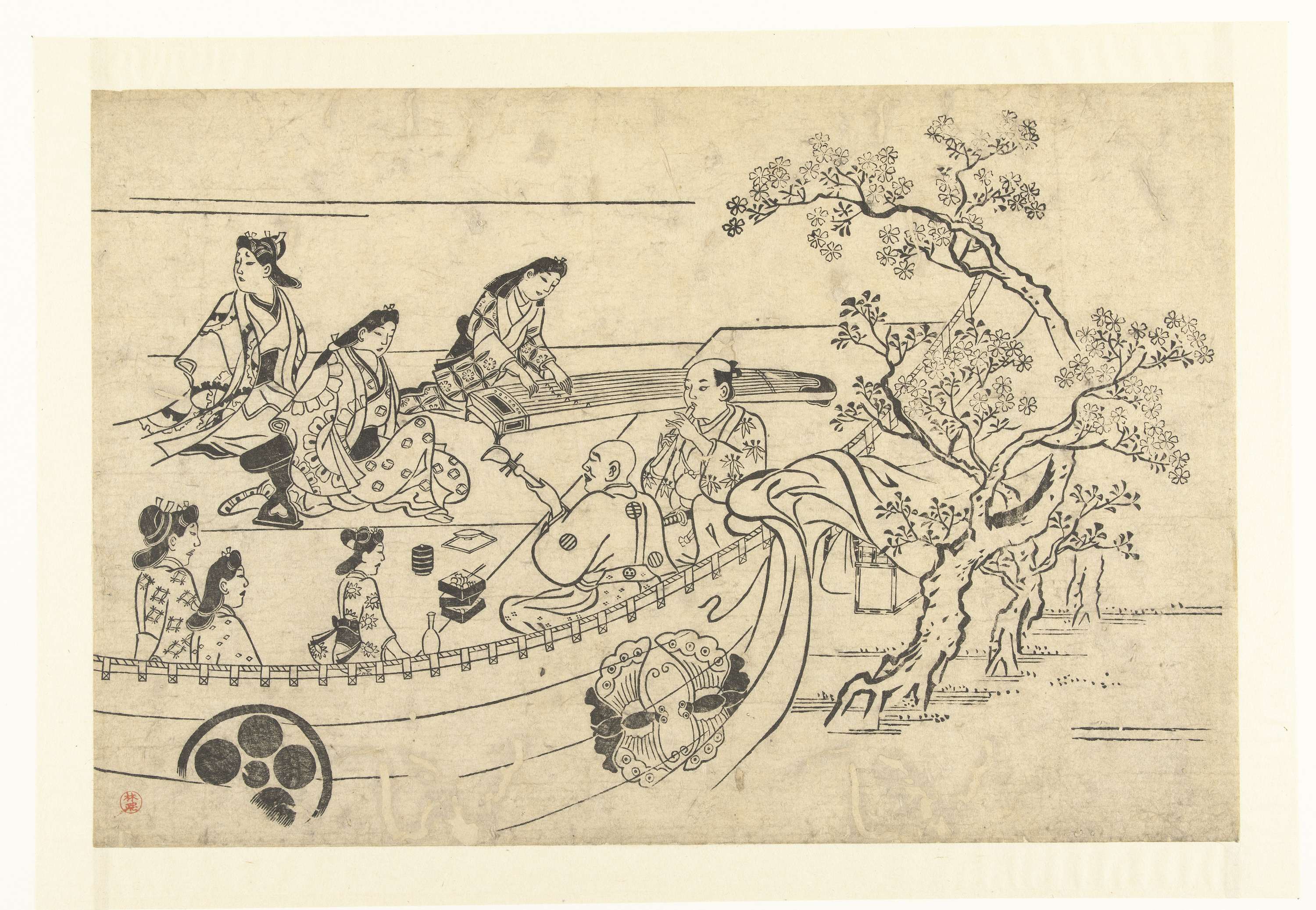 De vroegste Japanse prenten werden met één houten blok gedrukt. De afbeeldingen bestonden uit zwarte lijnen en vlakken. Moronobu was een van de eerste kunstenaars die met de houtsnede-techniek prenten maakte. Vaak verbeeldde hij gebeurtenissen in en rond de stad, zoals deze muzikale picknick onder de kersenbloesem. Het doek op de voorgrond met de familiewapens ...