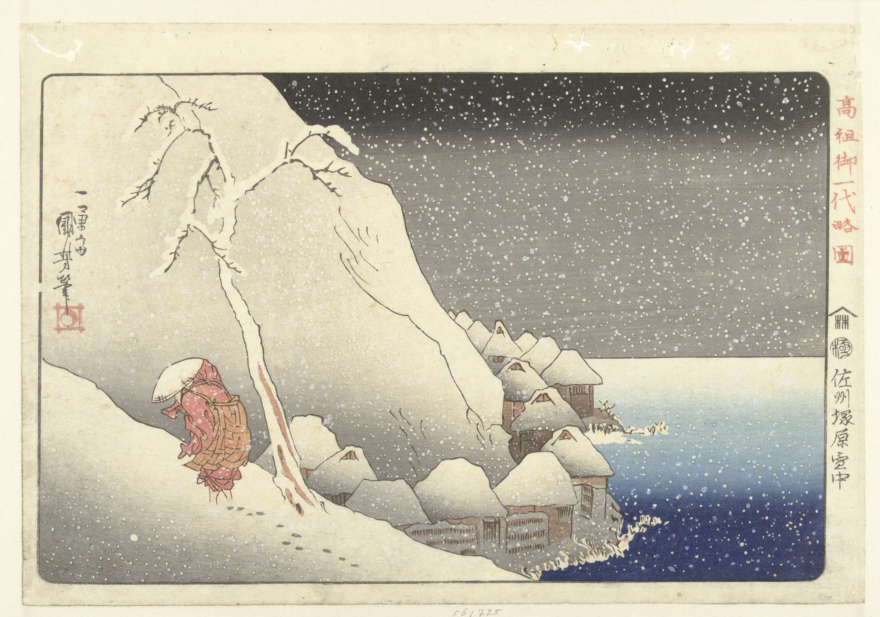 Sneeuwlandschap met op de voorgrond Nichiren, grondlegger van de boeddhistische Lotus sekte, in rood gewaad, een besneeuwde helling beklimmend; onderaan de berg een dorpje aan zee; bij een grijze lucht met dwarrelende sneeuwvlokken.