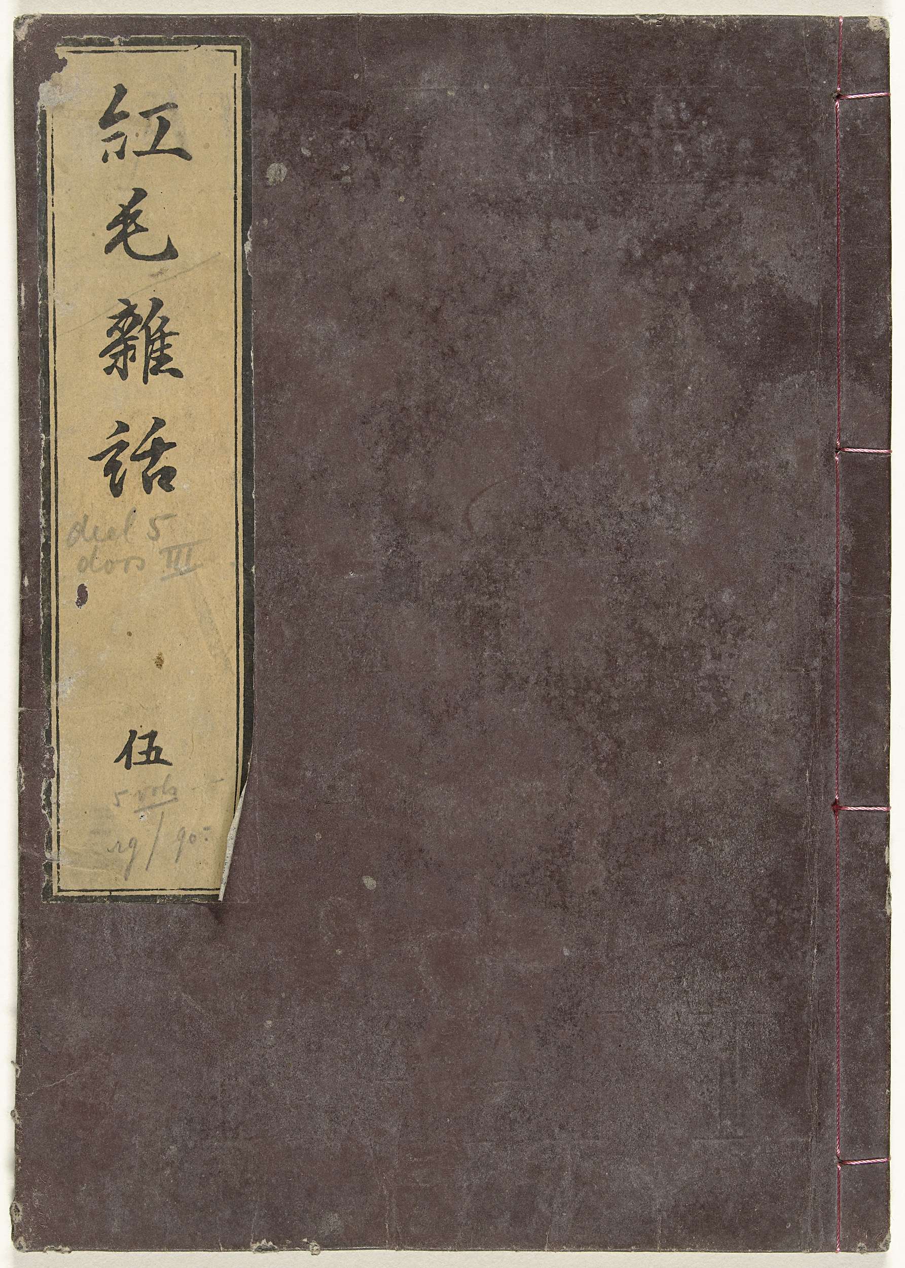 Deel vijf (van vijf); roodbruine kaft met in blinddruk 'algemeen waereld kaart'; linksboven titelstrook; 21 bladen, genummerd: 1-9, beschrijving en afbeeldingen van een elektriciteitsmachine en een fontein; 1-9, beschrijving en afbeeldingen van Hollandse kledingstukken; drie bladen nawoord; dekblad, advertenties.