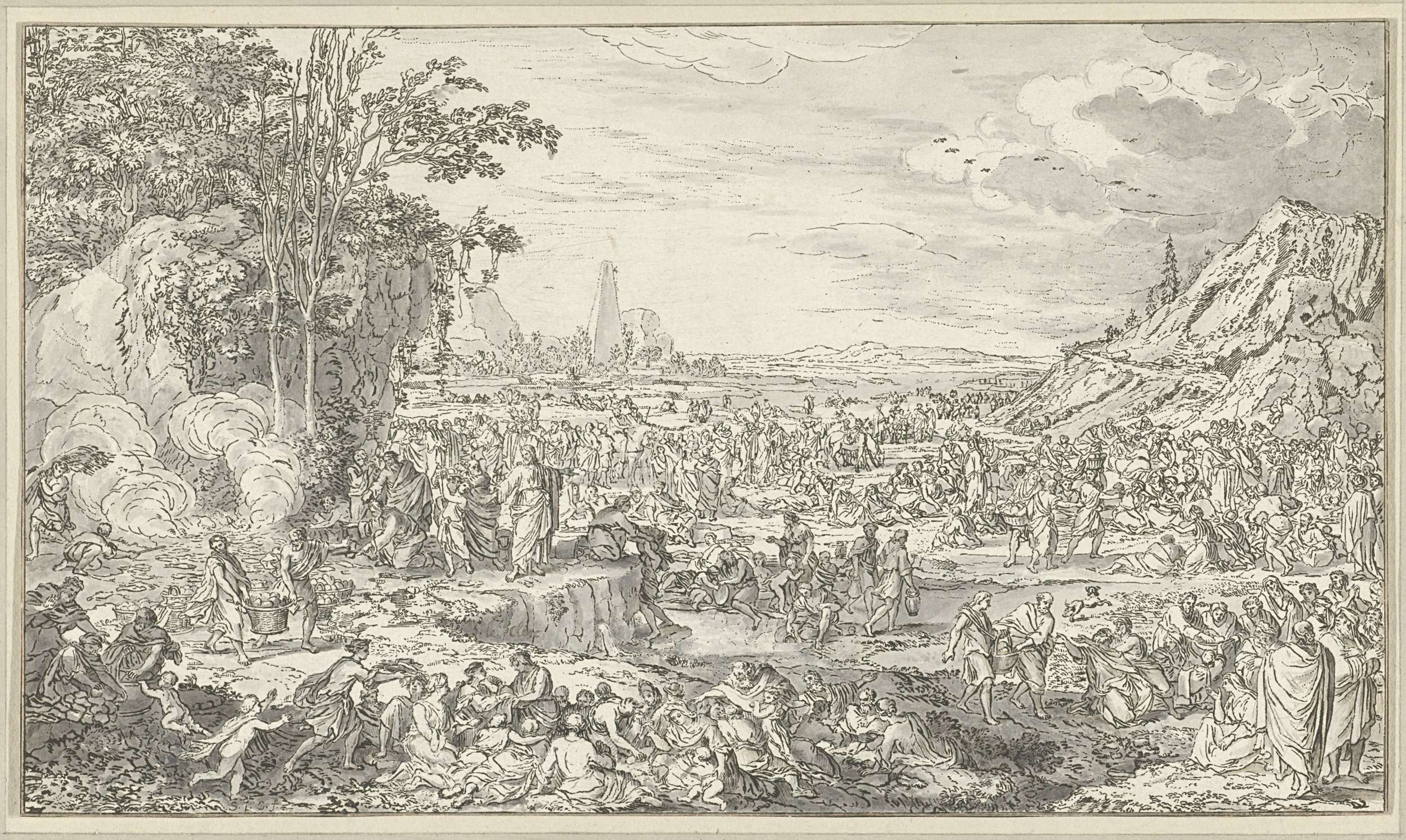 Christus laat de broden en vissen van de kleine jongen, die naast hem staat, verdelen over de menigte. De discipelen dragen en verdelen twee aan twee de manden met brood.