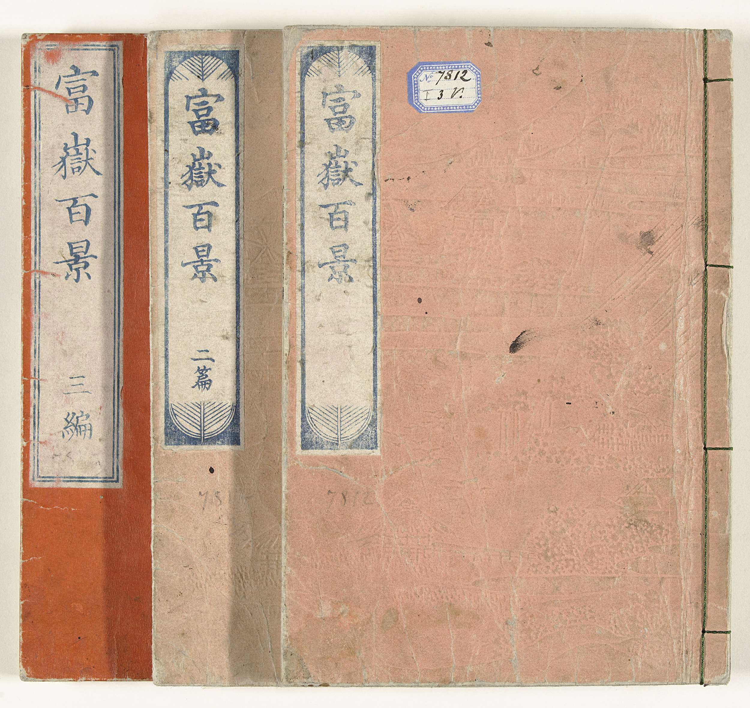 Drie delen (compleet) met zwart-wit afbeeldingen van de berg Fuji; bewaard in rode chitsu (uitklapbaar doosje).
