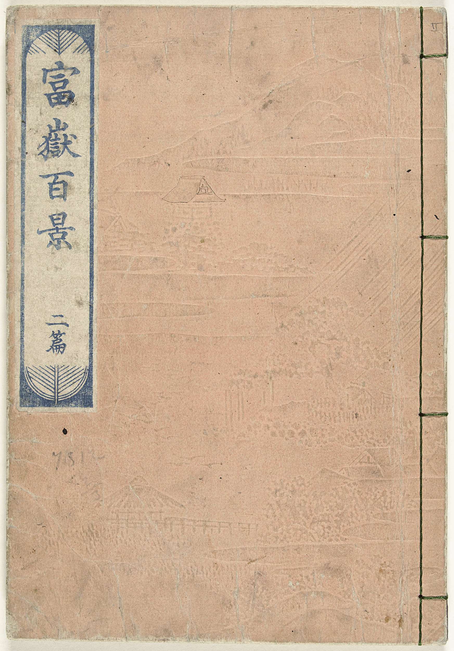 Deel twee (van drie) van het Fuji boek van Hokusai; roze kaft met landschap in blinddruk; linksboven blauw-witte 'valkenveer' titelstrook; binnenkant kaft, titelpagina; 27 bladen: één blad, voorwoord; 25 bladen, zwart-wit afbeeldingen; laatste blad, colofon en advertenties; binnenkant achterkaft, advertentie. Eerste editie.
