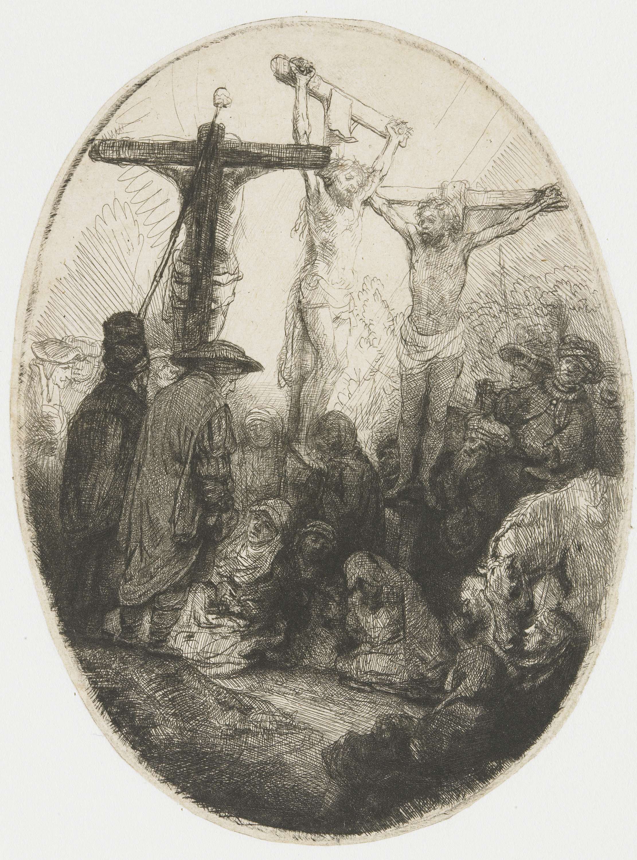 Op uiteenlopende momenten in zijn loopbaan verbeeldde Rembrandt Christus aan het kruis. Op het bovenste etsje, de vroegste van deze twee, liet hij de moordenaars weg die bij dezelfde gelegenheid gekruisigd werden. Christus kijkt naar zijn moeder, die terugkijkt en bezwijkt. In de latere prent nam Rembrandt de moordenaars wel op en richt een van ...