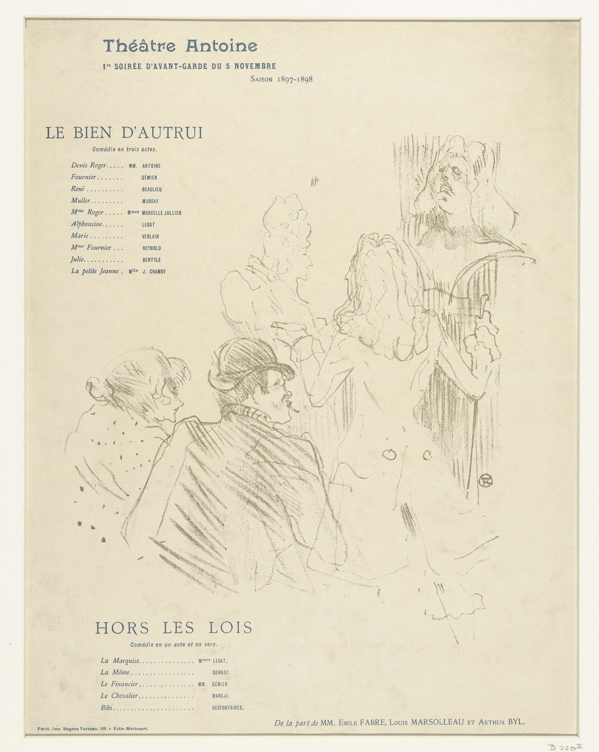 Programma voor twee toneelstukken met de titels Le bien d'autrui en Hors les lois. Vier acteurs staan bij de buste van Molière. Het Théâtre Antoine bracht met dit komische toneel een eerbetoon aan de Franse toneelschrijver. Onder beide titels staat een rolverdeling met namen van acteurs en rollen.
