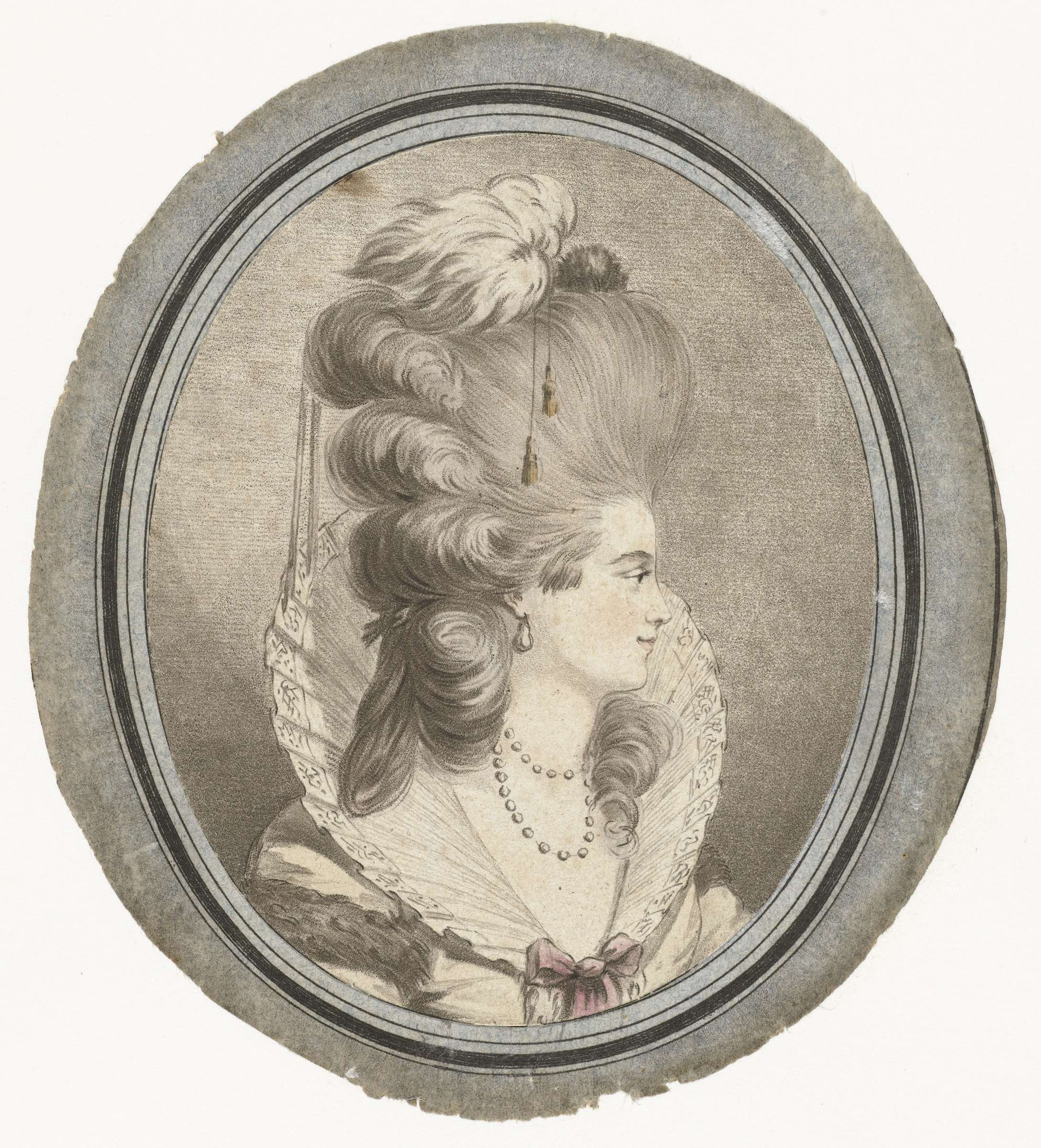 Buste van een vrouw, en profil naar rechts, met een hoge kraag en een hoog kapsel of pruik.