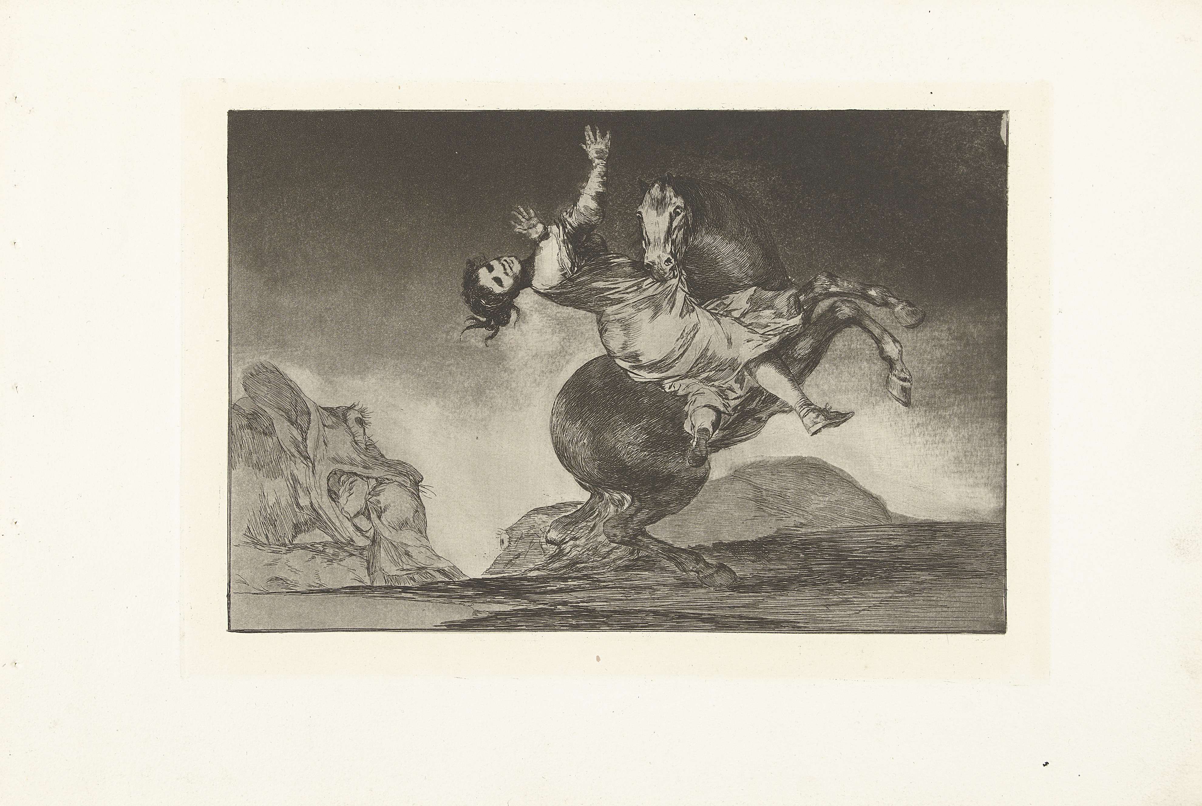 Een vrouw wordt bij haar kleding opgetild door een steigerend paard. Links op de achtergrond wordt een vrouw opgegeten door een monster. Uit een serie van achttien prenten.