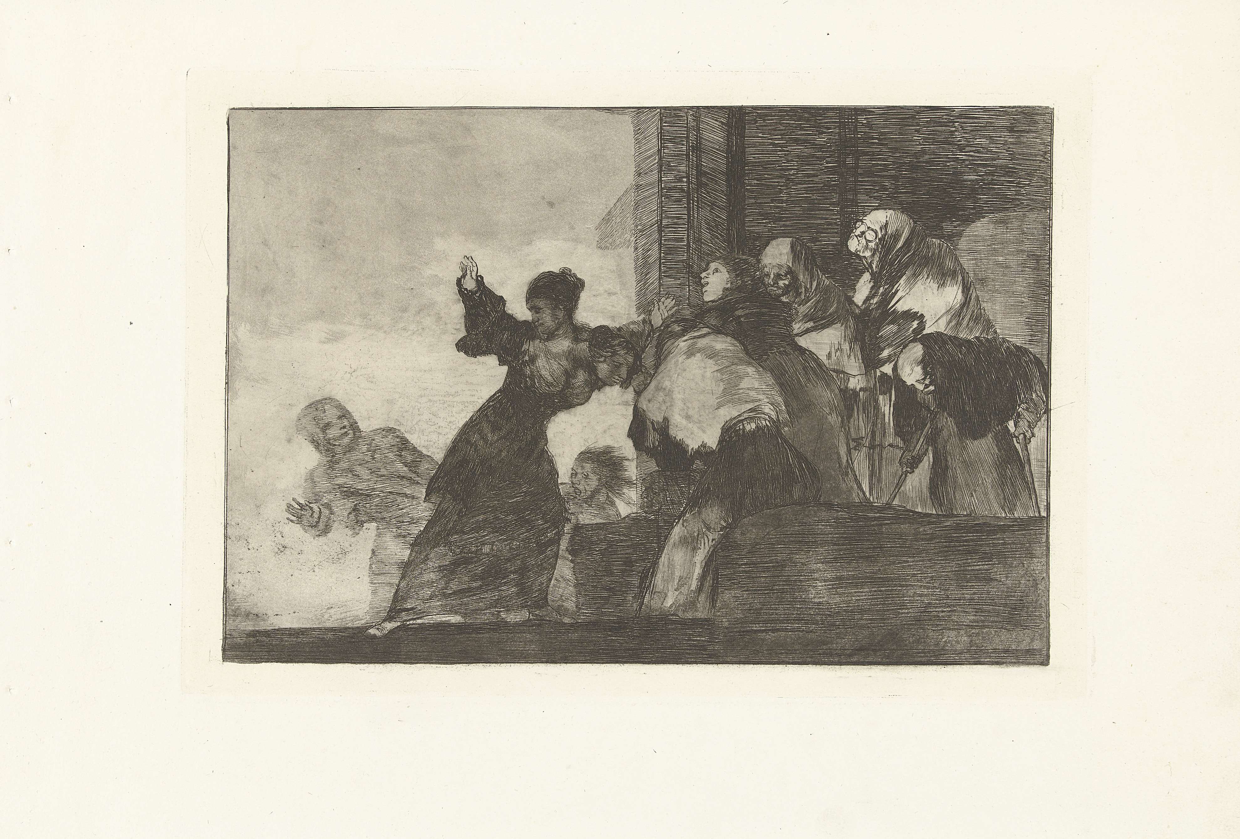 Een vrouw met twee hoofden, haar armen in de lucht geheven, en een groep oude mensen. Uit een serie van achttien prenten.