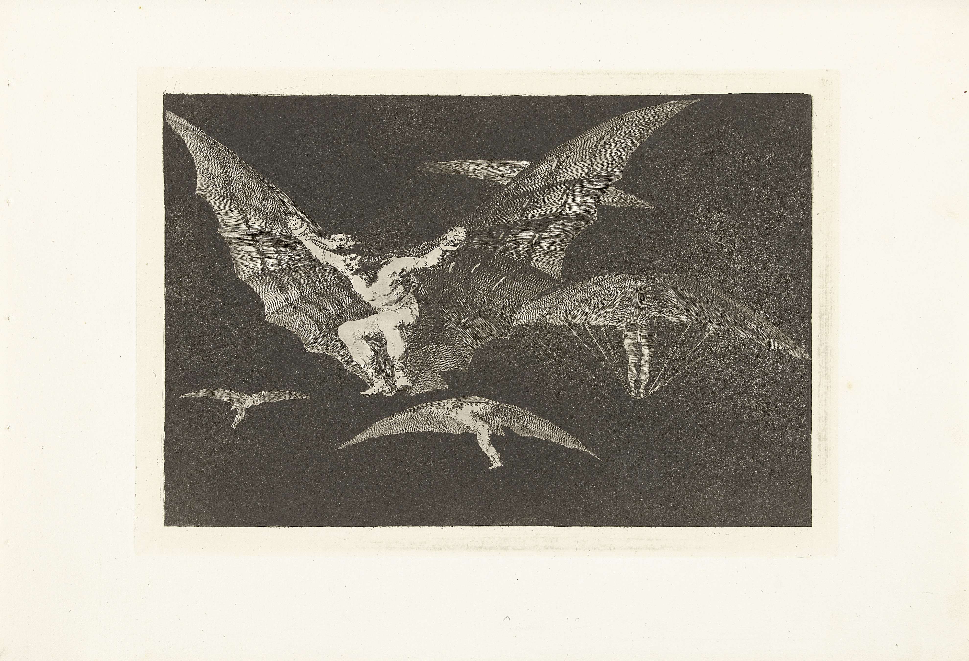 Mannen met vleugels op hun rug die zij door middel van touwen met handen en voeten bedienen. Op hun hoofd een muts in de vorm van een vogelkop. Uit een serie van achttien prenten.