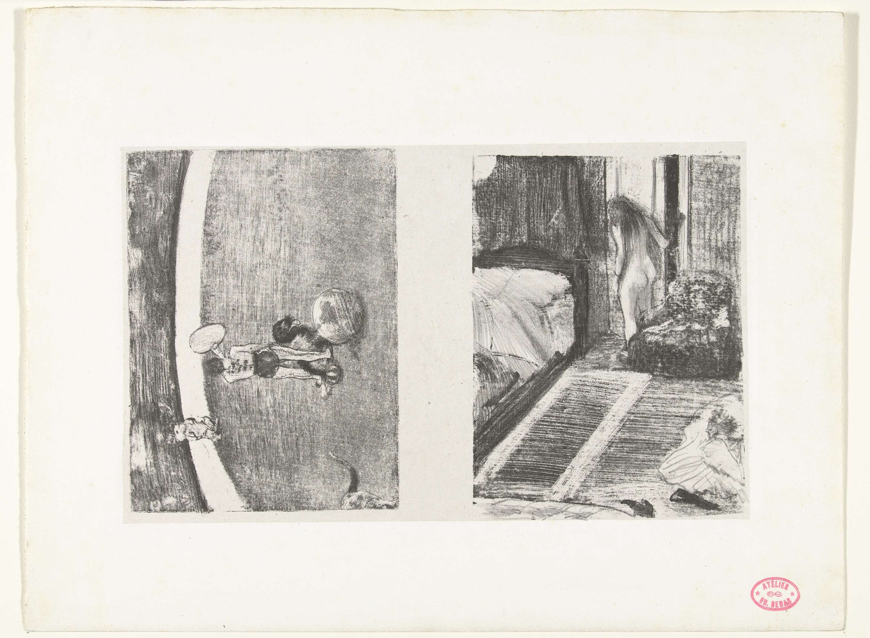 Blad met twee voorstellingen: links de piste van het circus Fernando in Parijs met een optreden van een man met honden, rechts een naakte vrouw staand bij een deur in haar slaapkamer. Beide voorstellingen zijn van monotype overgebracht op steen, het interieur is op de steen uitgewerkt in krijt en de kunstenaar heeft textuur aangebracht ...