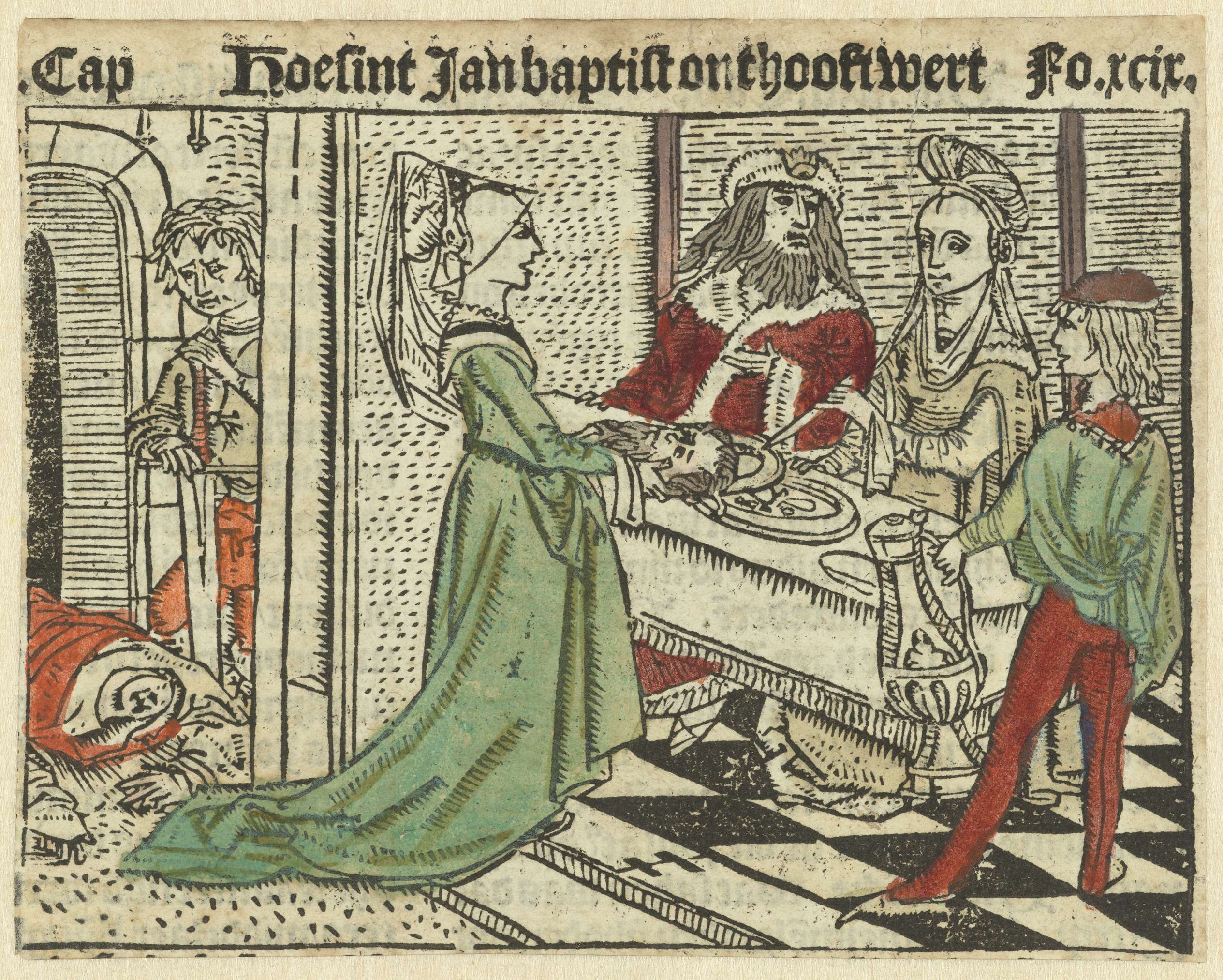 Salomé met hoofd Johannes op schaal. Herodias en man aan tafel. Onthoofde lichaam van Johannes ligt buiten, ernaast zit beul met zwaard.