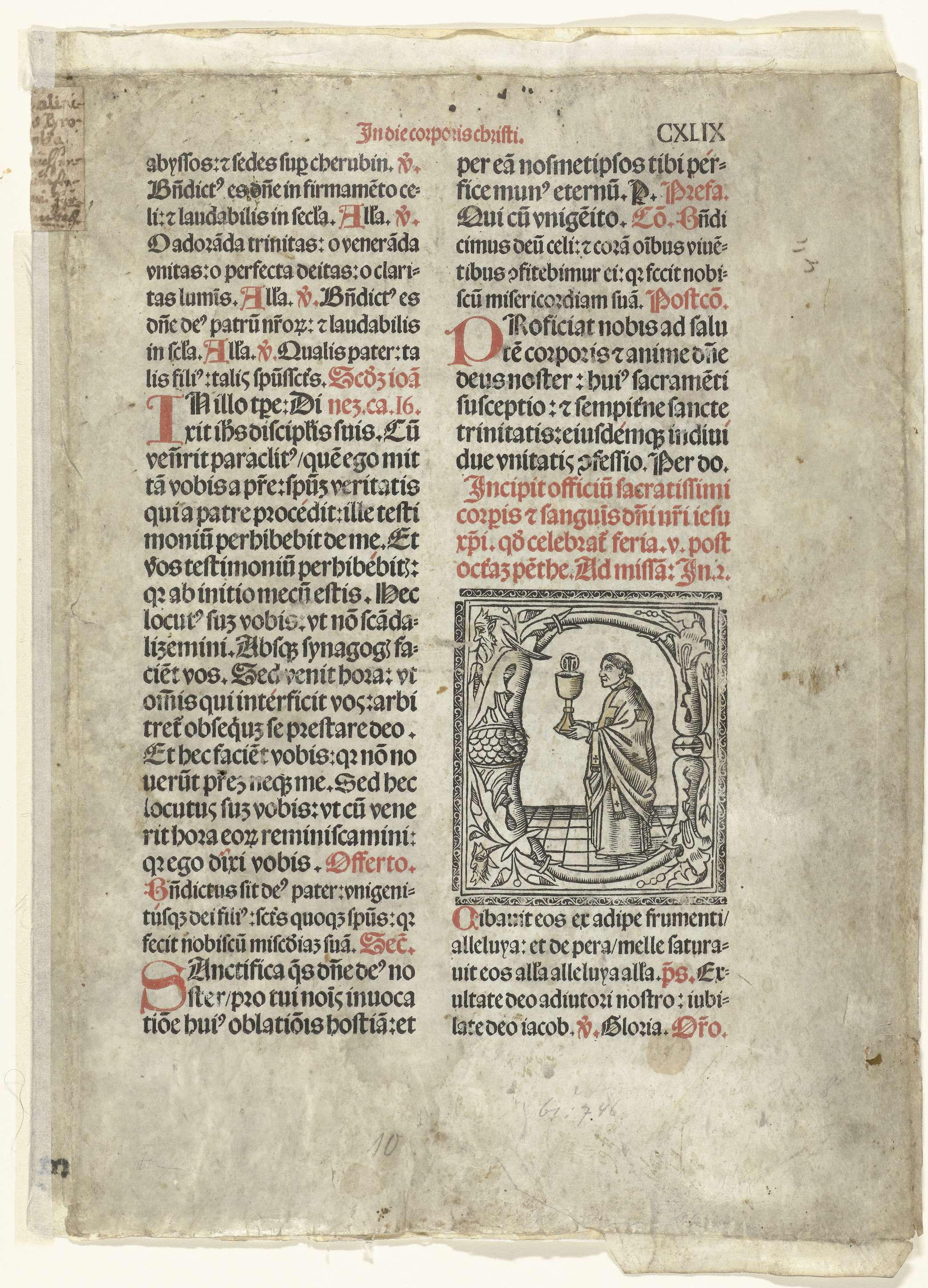 Blad uit een Italiaanse incunabel met liturgische verzen en illustratie van een priester met miskelk