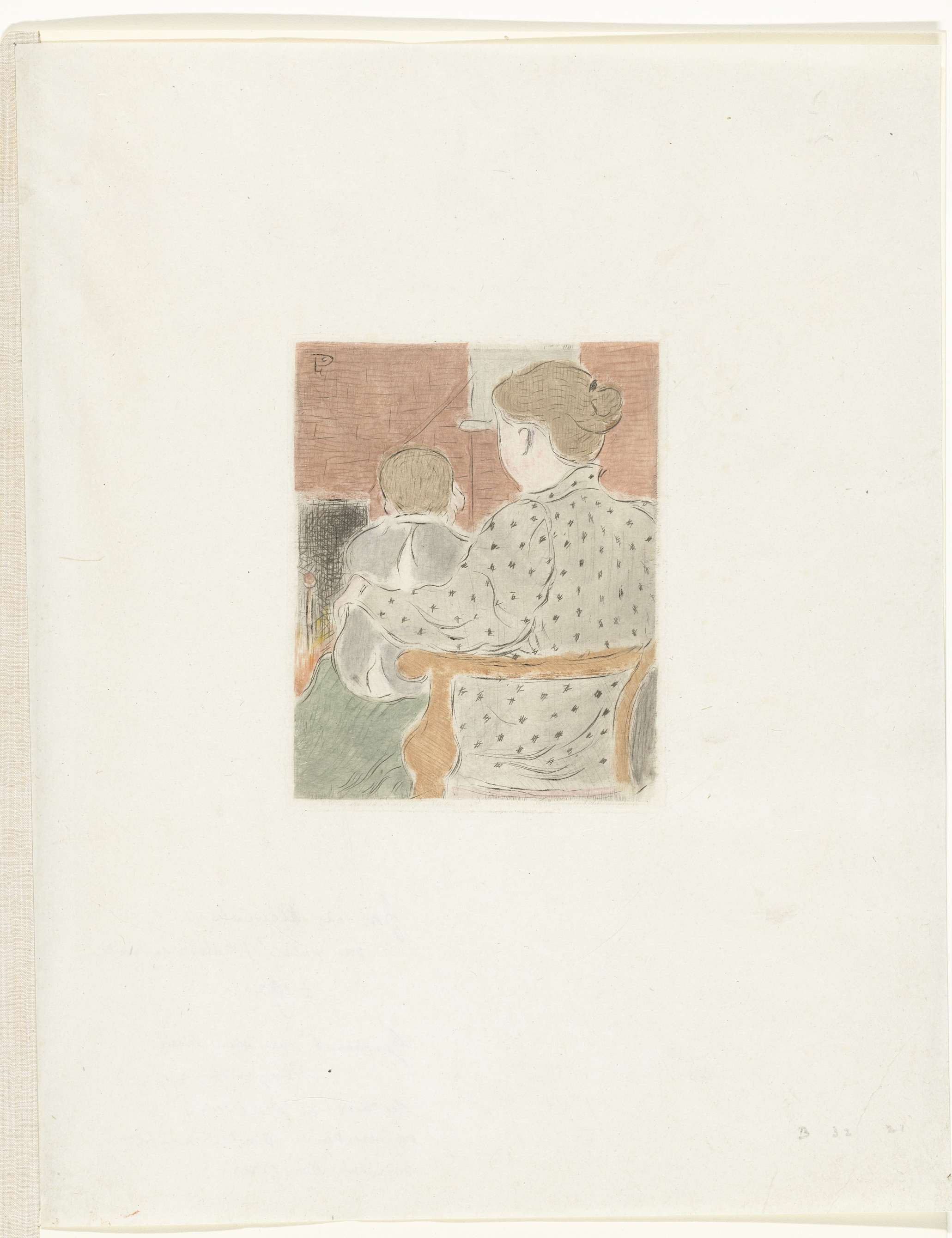 Moeder met een kind op schoot, op de rug gezien.