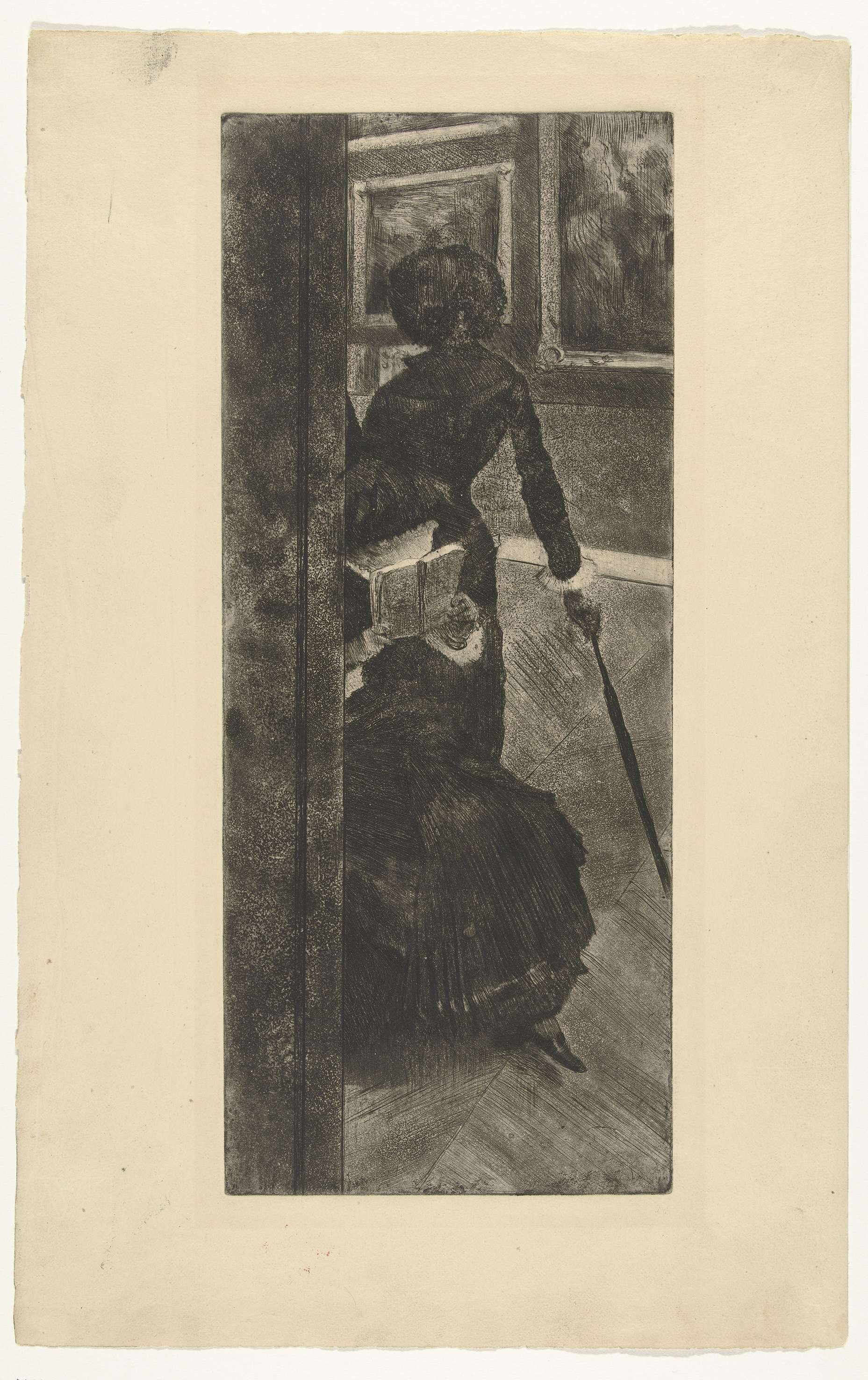 Twee vrouwen als bezoekers in een museumzaal met schilderijen van het Louvre in Parijs. De staande elegante vrouwenfiguur met de hoed en paraplu, op de rug gezien, kan geïdentificeerd worden als Mary Cassatt. De zittende vrouw raadpleegt een boekje en kijkt naar de schilderijen. Opvallend is de uitsnede van de voorstelling met links een deel ...