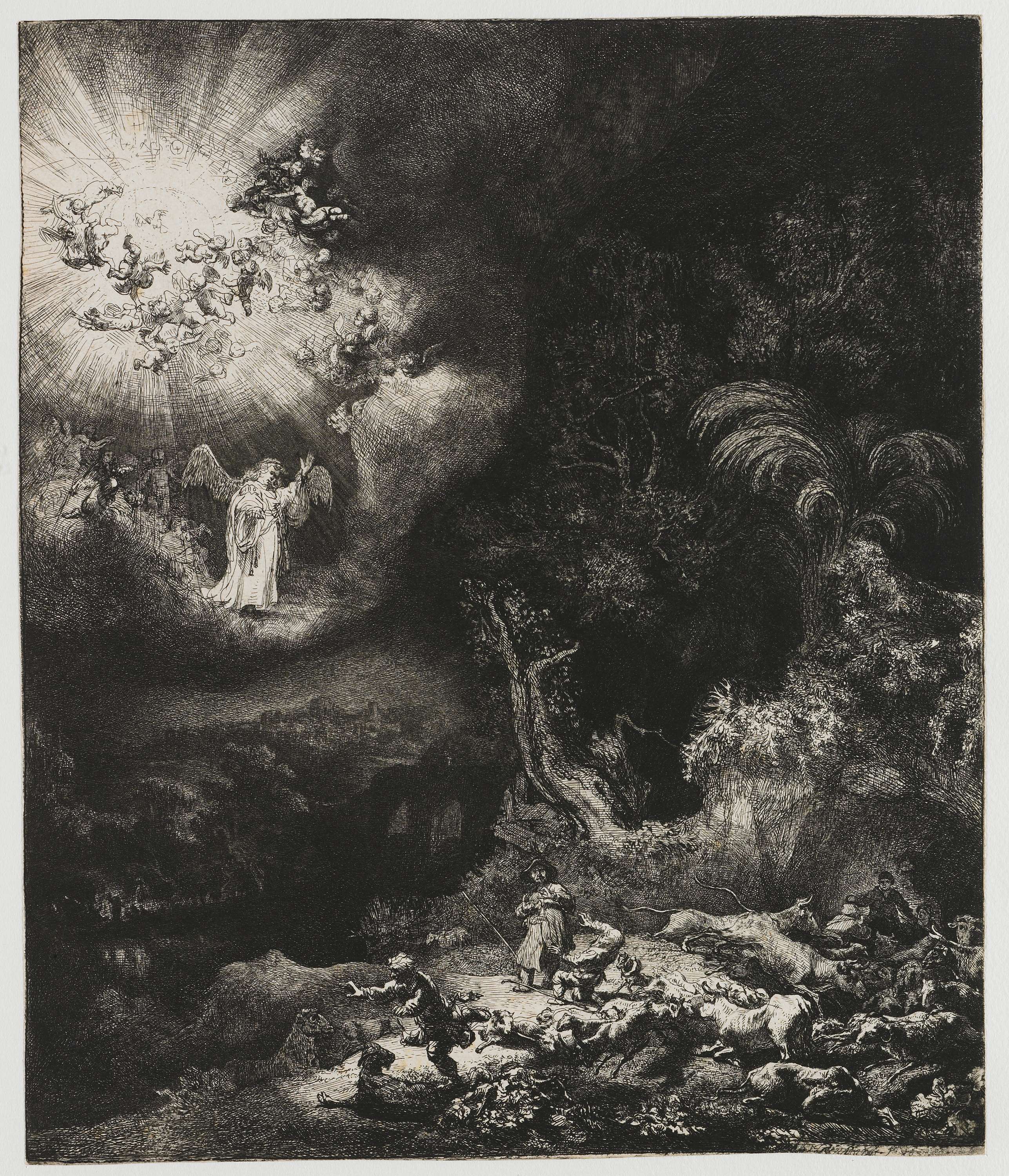 In zijn vroegere werk, uit de jaren 30, heeft Rembrandt een voorkeur voor drama. Zo ook hier, in zijn eerste nachtelijke scène op de etsplaat. Een engel, omstraald door de glorie des Heren, brengt de blijde boodschap van Christus’ geboorte. Op de grond breekt totale paniek uit: het vee stuift alle kanten op en de ...