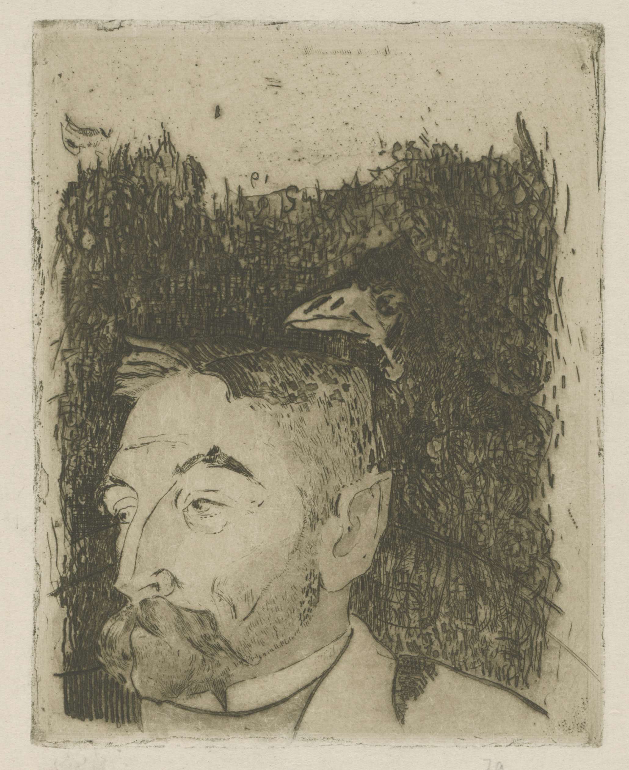 Portret van de symbolistische schrijver Stéphane Mallarmé. Achter het portret de kop van een raaf, ontleend aan Manets illustratie van The Raven door Edgar Allan Poe. Mallarmé vertaalde dit gedicht in 1874 in het Frans.