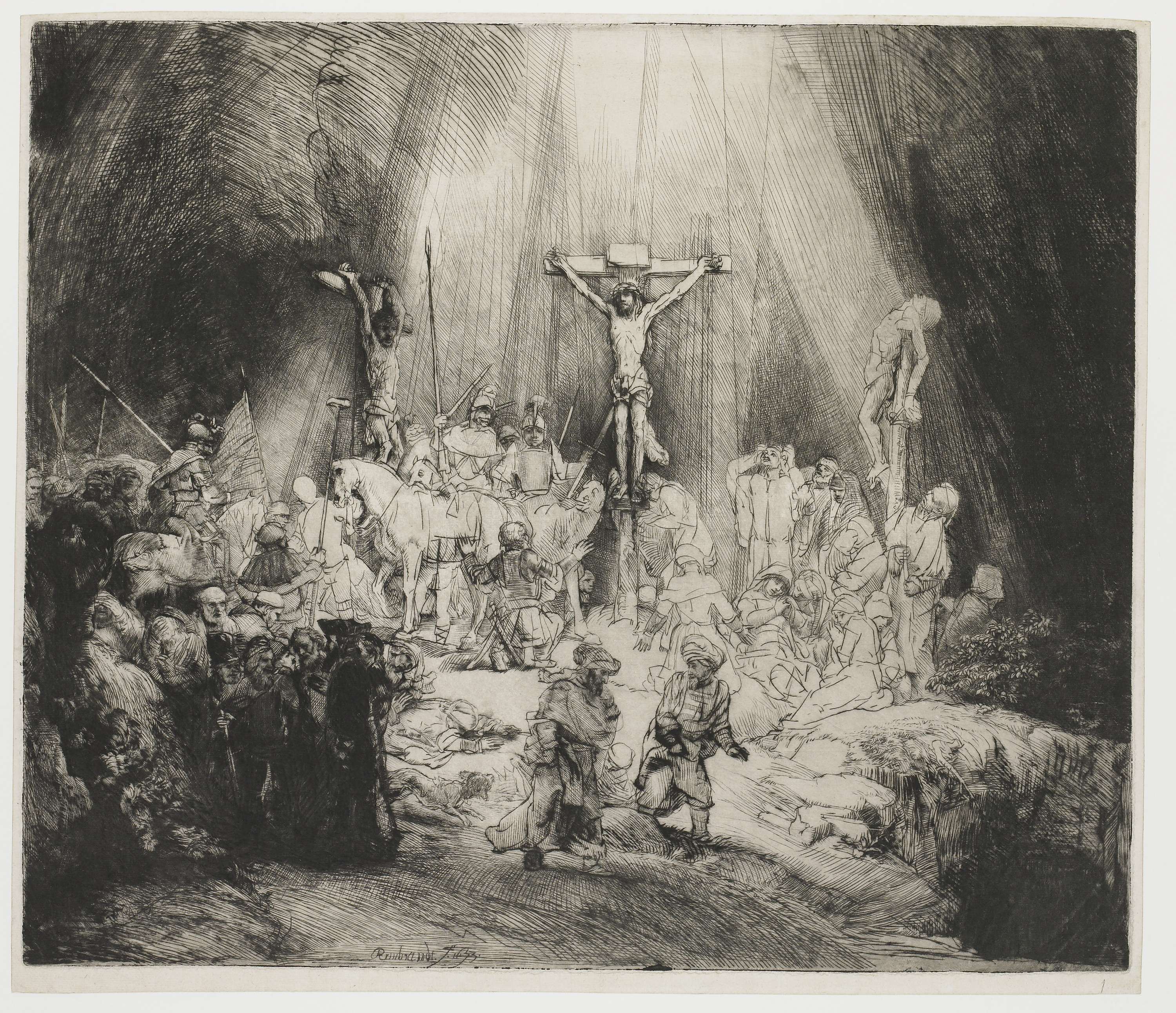 Als je in een etsplaat krast, ontstaat er een opstaand randje, een zogeheten ‘braam’. De braam, die drogenaaldlijnen zo’n fraai fluwelig karakter geeft, slijt snel weg. Daardoor vermindert het decoratieve effect van de techniek en wordt de voorstelling steeds lichter. Hier loste Rembrandt dat probleem op door de schaduwpartijen weer donkerder te maken met extra ...