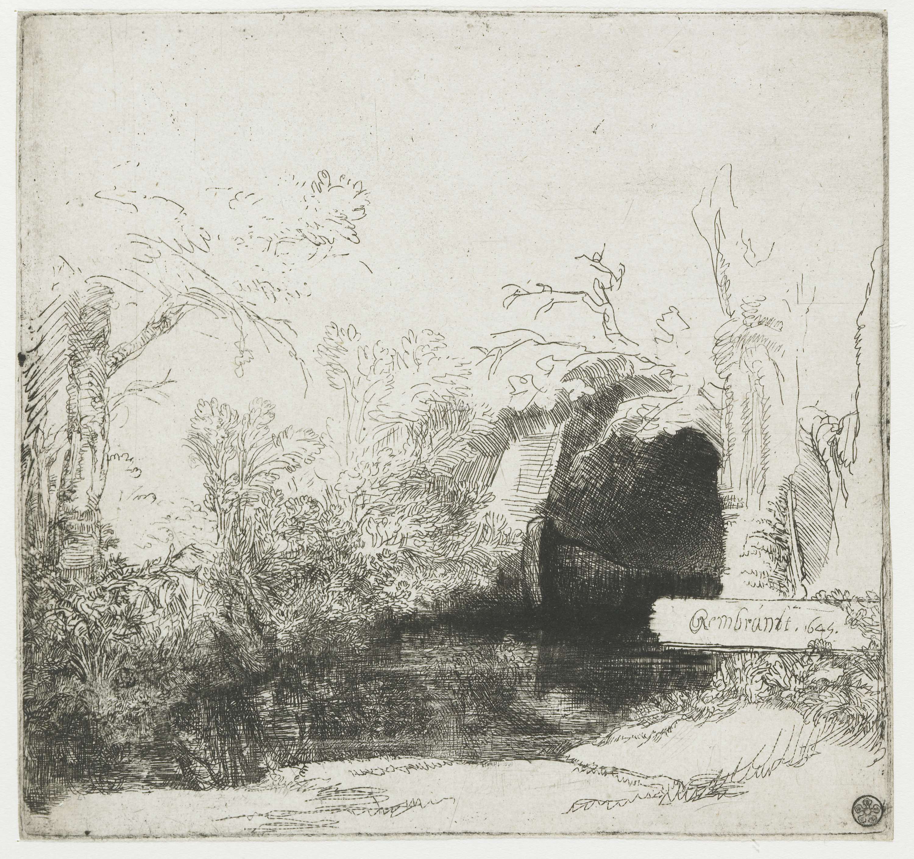 De boot is nauwelijks zichtbaar in de schaduwrijke grot. De donkere partij contrasteert met de omgeving die met een paar schetsmatige lijnen op de plaat is gezet. Deze ets lijkt onvoltooid, maar is toch gesigneerd, gedateerd en regelmatig afgedrukt. Het is opmerkelijk dat Rembrandt dit landschap koos om zijn naam zo prominent naar voren te ...