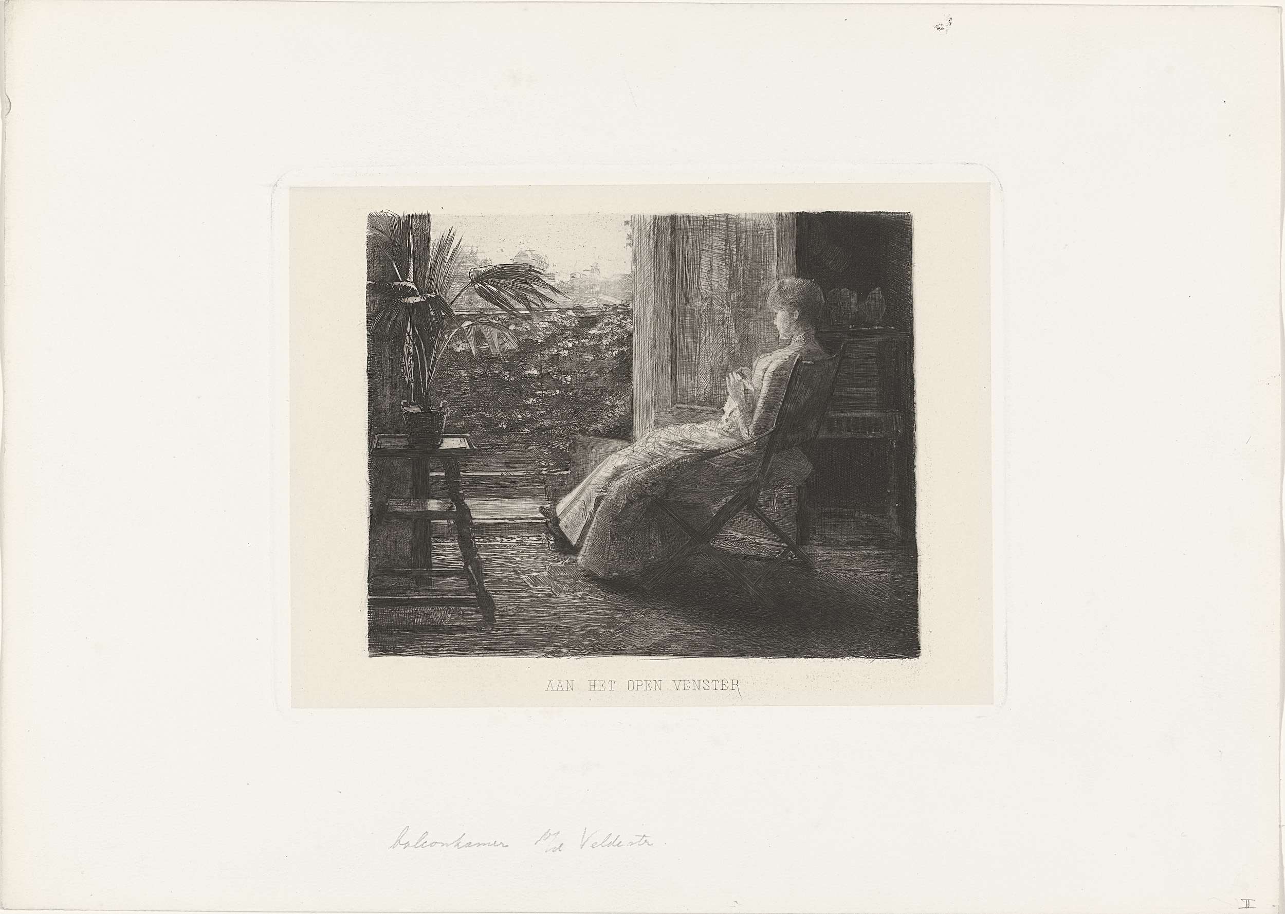 Een jonge vrouw zit met een borduurwerk voor de geopende deuren van het balkon. Naast haar staat op een krukje een kamerplant.