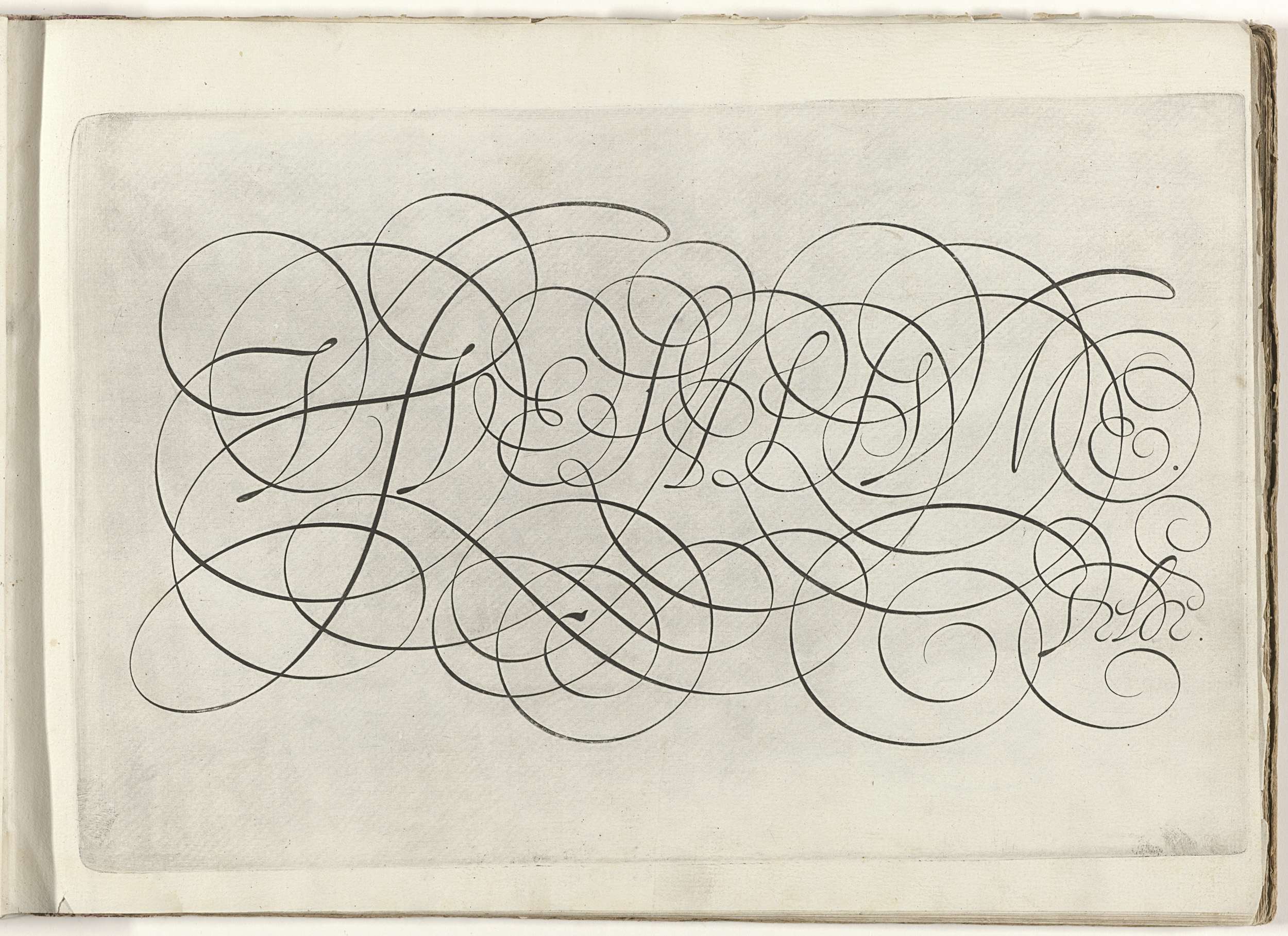 In overdadig gekrulde en doorvlochten Italiaanse kapitaalletter de tekst: Vive la plume. Rechtsonder: Velde. De prent maakt deel uit van een album.