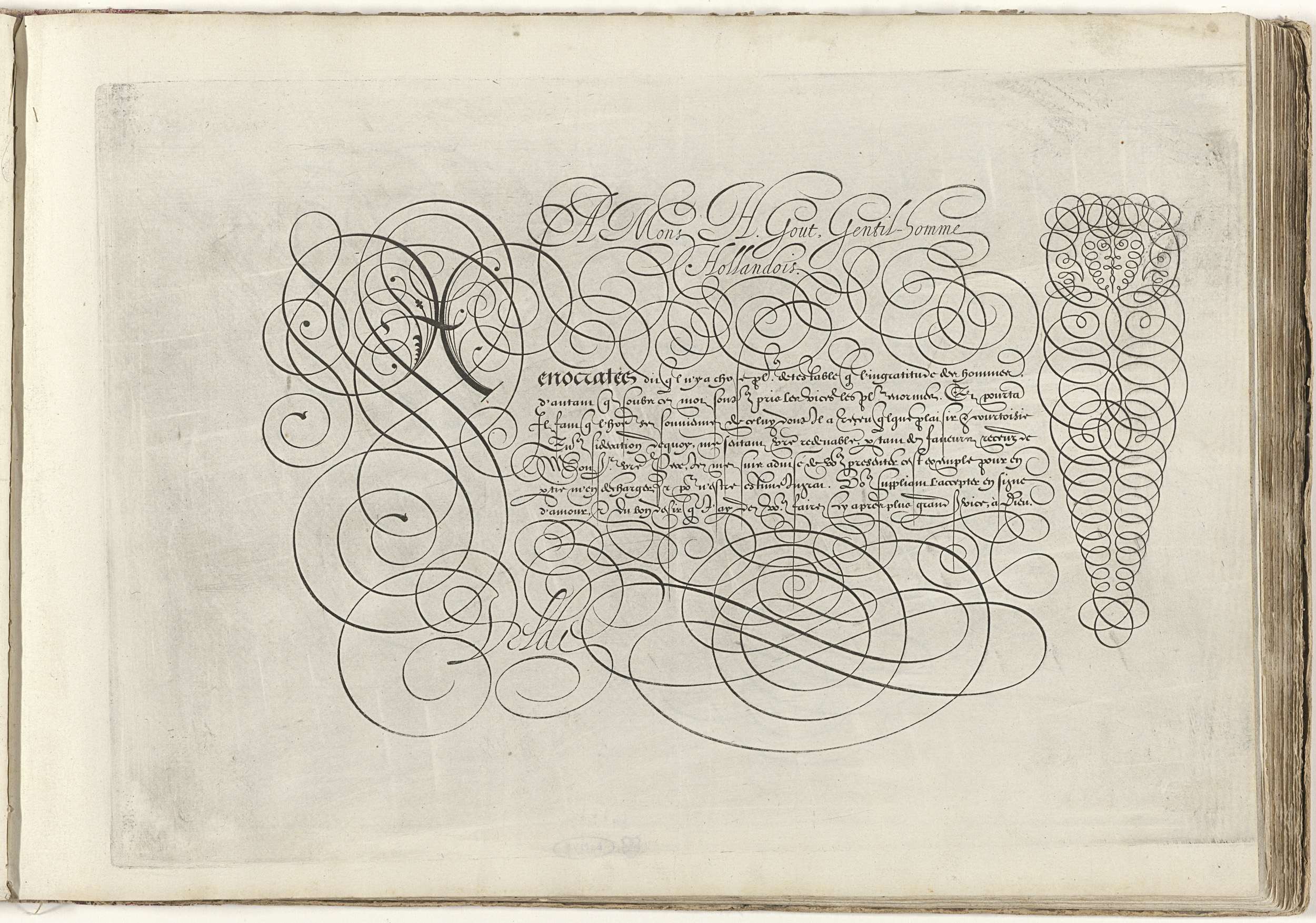 Schrijfvoorbeeld met de aanhef: A mons H. Gout gentil-homme Hollandois. Daaronder in een andere letter een initiaal X en zeven regels tekst in het Frans: Xenocrates dit q(ui)l n'y a ... De tekst is omlijst door krulwerk. De prent maakt deel uit van een album.