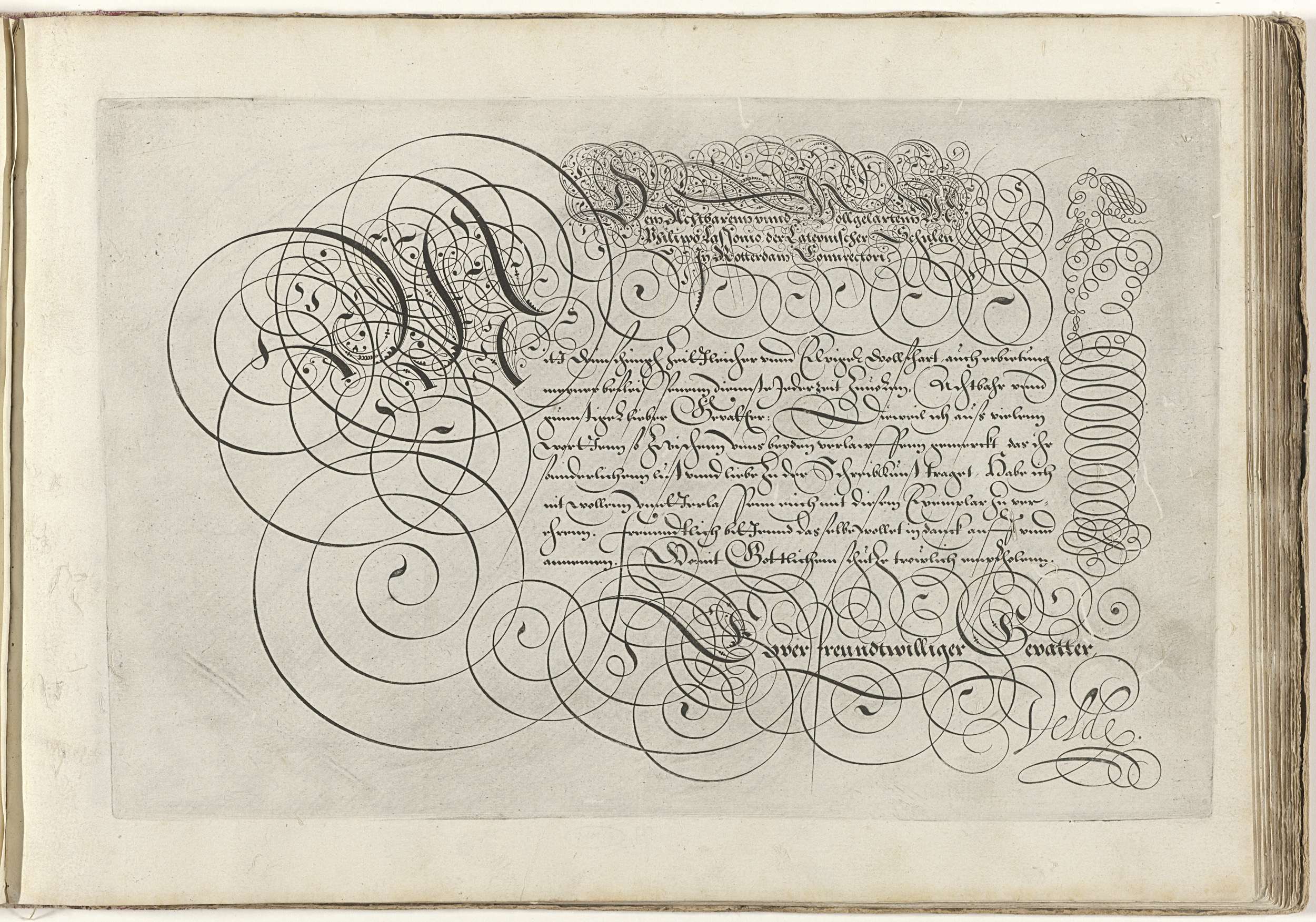 Schrijfvoorbeeld met de aanhef: Den achtbarem unnd volgelartem Mr Philippo Lassonio der lateynischer schulen In Rotterdam connrectori. Daaronder een geornamenteerde initiaal M(?) en acht regels tekst in het Duits. Ondertekend: Euuer freundtwilliger gevatter, Velde. De tekst is omlijst door krulwerk. Aan de rechterzijde een herme of grenszuil in krulwerk. De prent maakt deel uit van ...