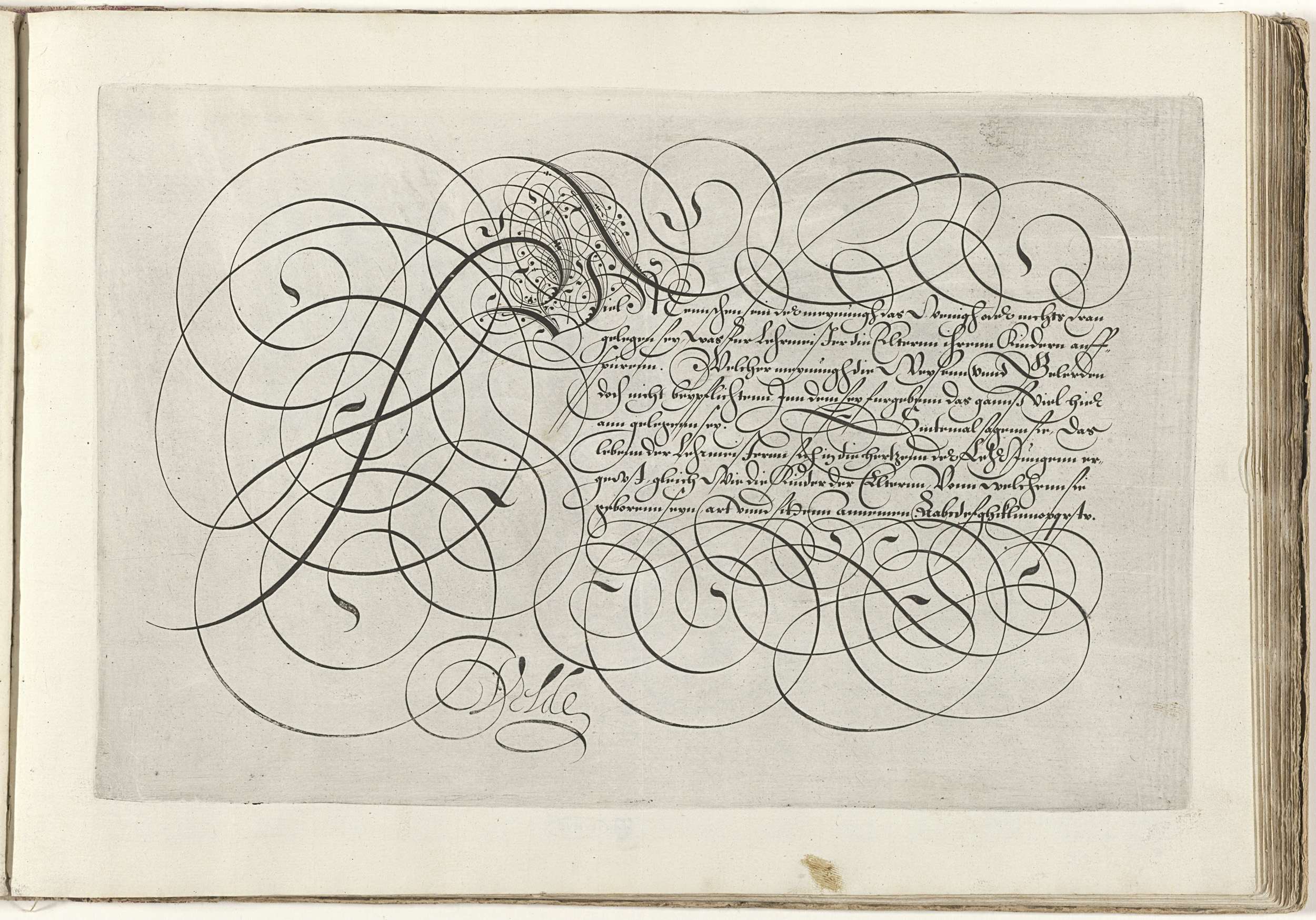 Schrijfvoorbeeld met geornamenteerde initiaal V en acht regels tekst in het Duits: Viel menschen ... Onderaan een onderkastalfabet in de betreffende hand. De tekst is omlijst door krulwerk. De prent maakt deel uit van een album.