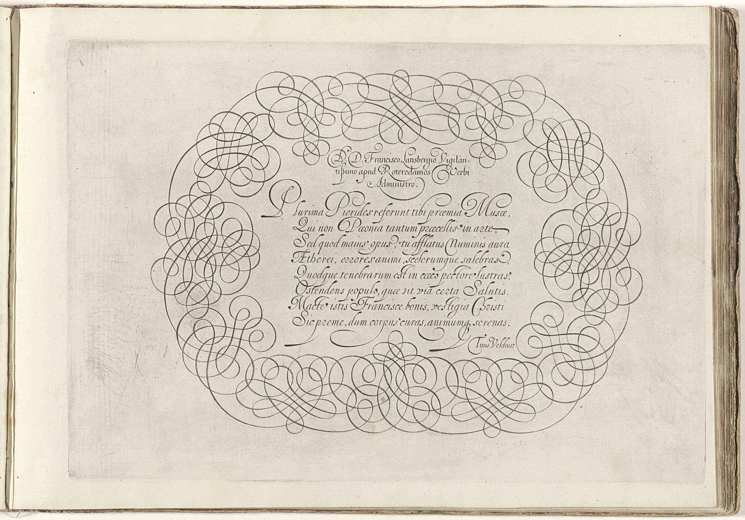 Schrijfvoorbeeld met de aanhef: D.D. Francisco Lansbergio vigilantissimo apud Roterodamos verbi administro. Daaronder acht regels tekst in het Latijn: Plurima pieridus referunt ... Ondertekend: Tuus Veldius. De tekst is omlijst door krulwerk. De prent maakt deel uit van een album.