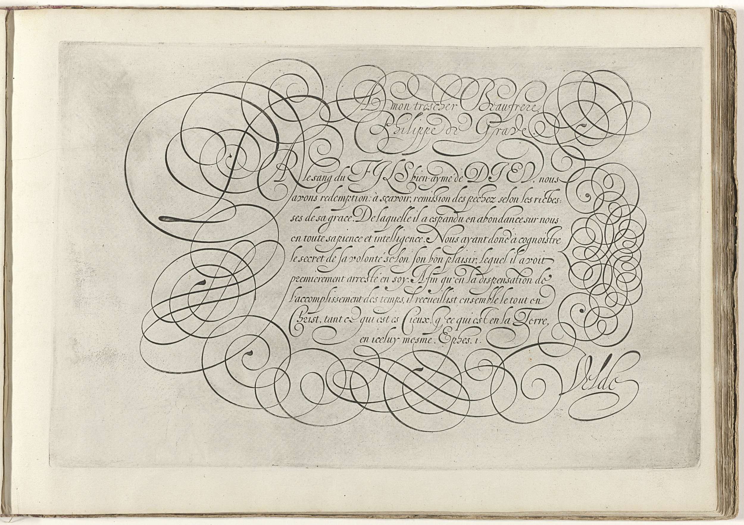 Schrijfvoorbeeld met de aanhef: A mon tres cher beaufrere Philippe de Grave. Daaronder negen regels tekst in het Frans: Par le sang du fils ... De tekst is omlijst met krulwerk. De prent maakt deel uit van een album.