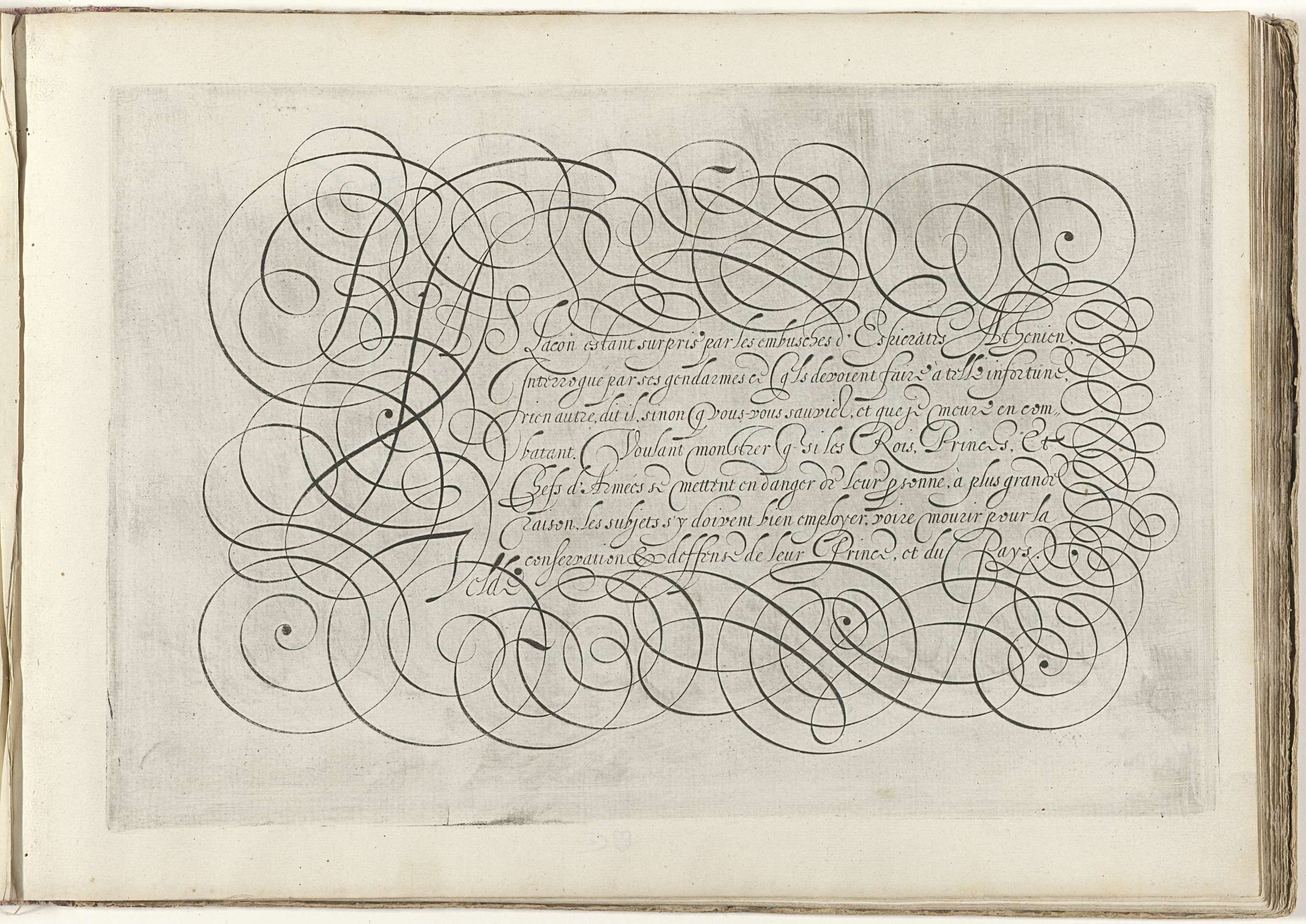 Schrijfvoorbeeld met zeven regels tekst in het Frans: Bias Lacon estant surpris ... De tekst is omlijst met krulwerk. De prent maakt deel uit van een album.